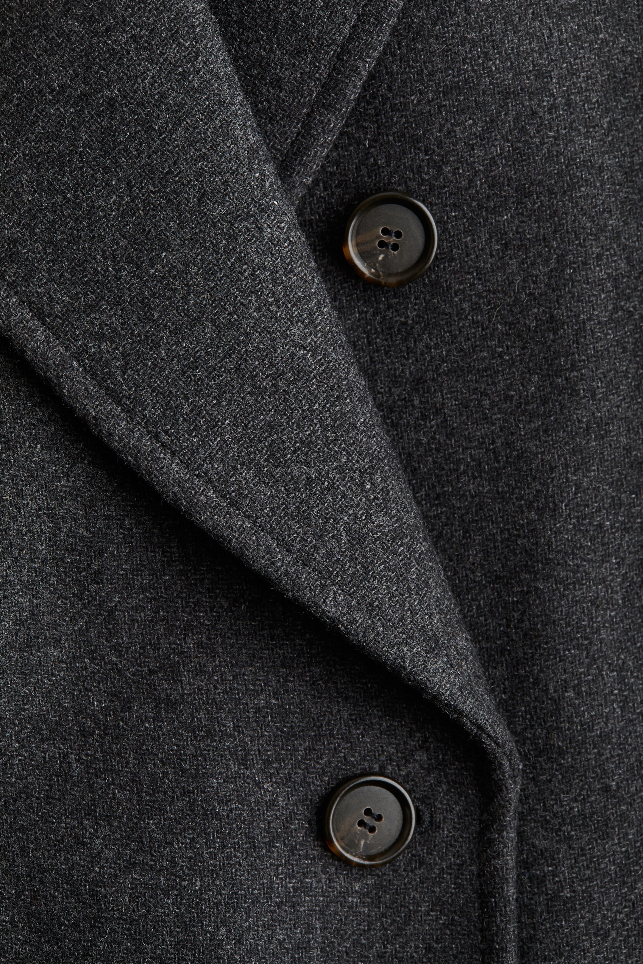 Polvipituinen, vuorillinen takki huovutettua villasekoitteista materiaalia italialaiselta Nova Fides -tekstiilivalmistajalta. Kaksirivinen etukappale, jossa terävät kauluskäänteet. Yksi rintatasku ja läpälliset etutaskut, kaikki teremallisia. Olkatoppaukset ja pitkät hihat, joiden suussa erittäin lähekkäiset napit. Helman takaosassa halkio.
