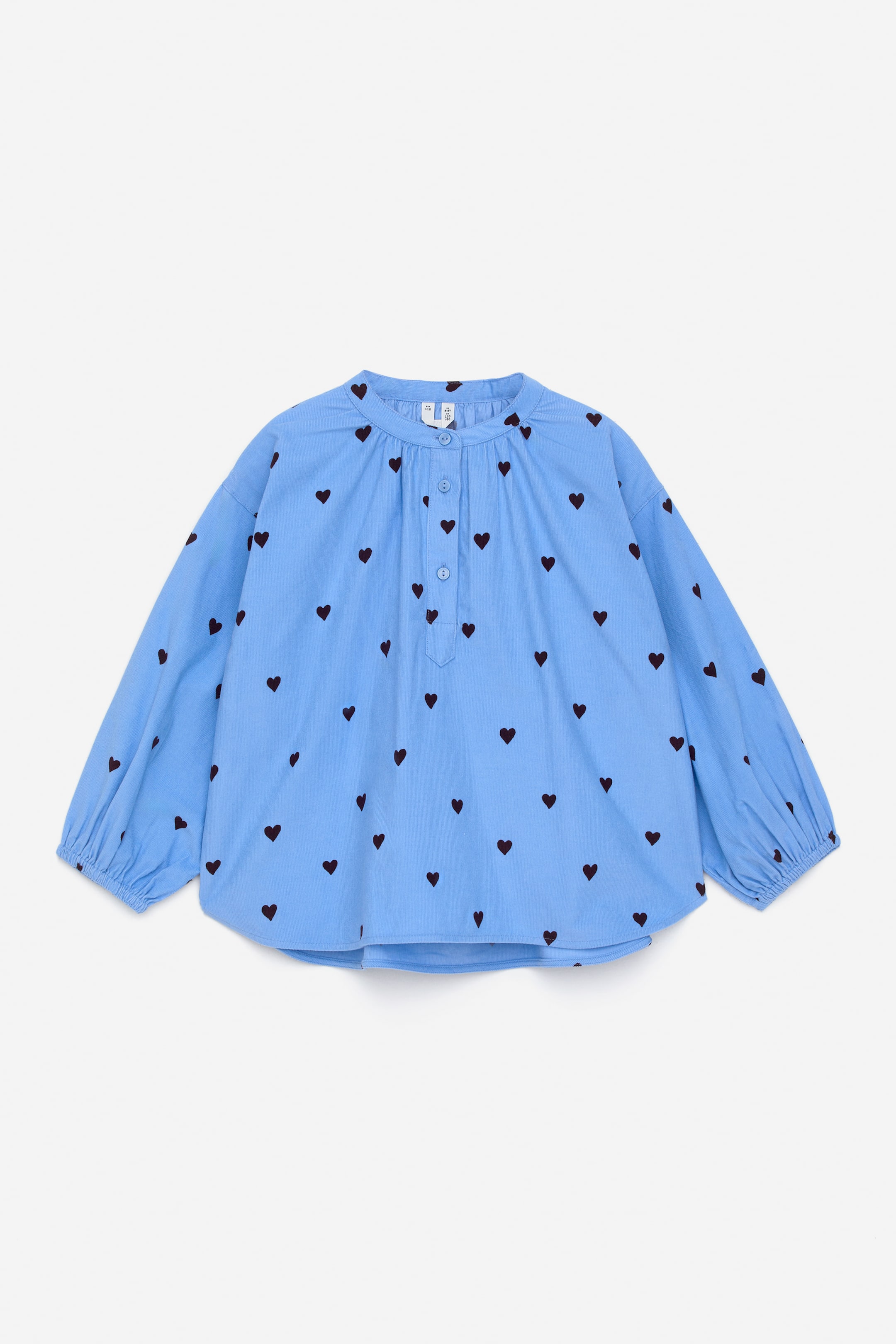 Pehmeästä vakosametista valmistettu pusero, jossa pystykaulus, puolinappilista ja madalletut hartiat. Poimutus pääntiessä ja hihansuissa. Rento istuvuus.