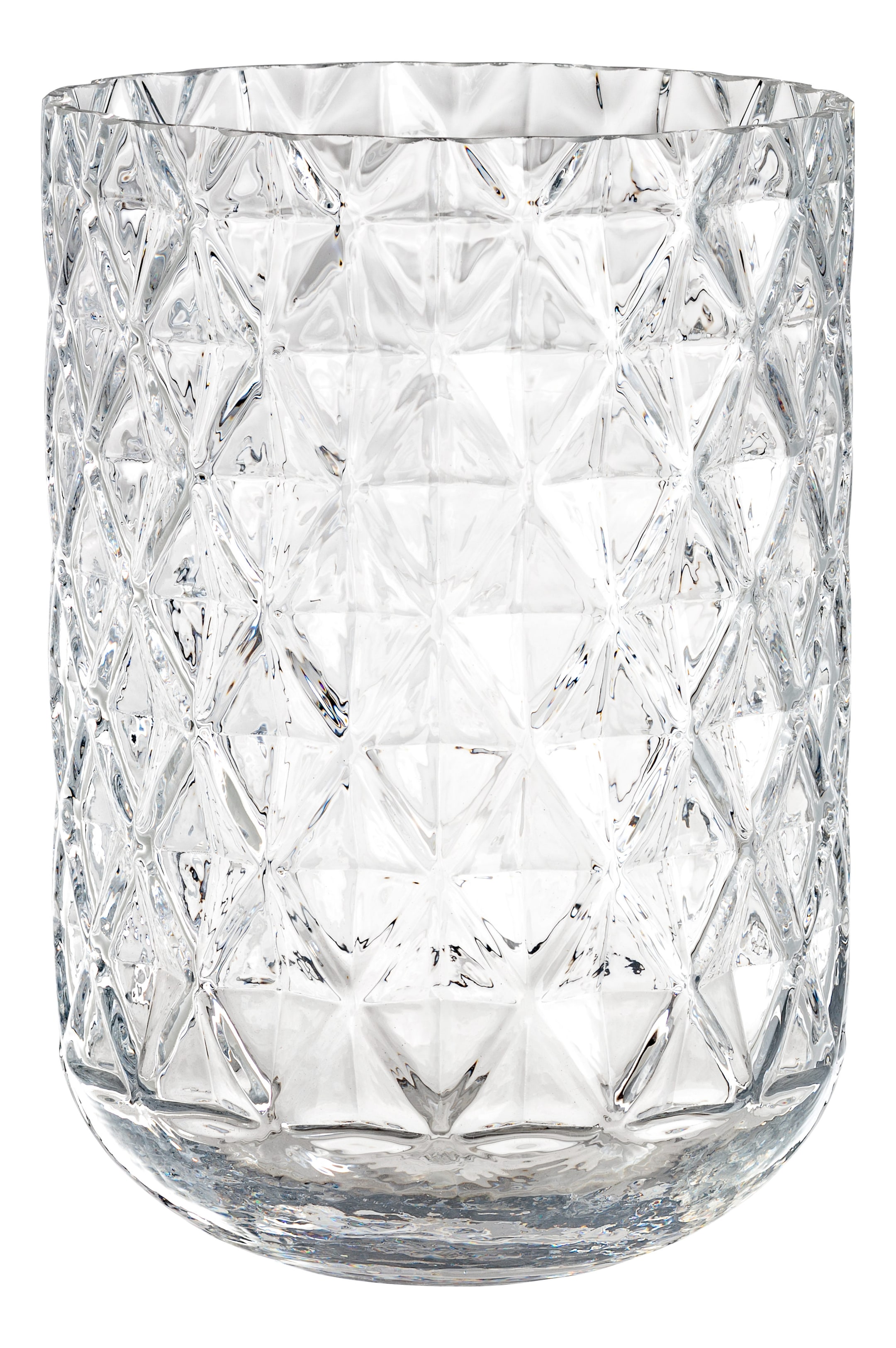 Grand vase en verre transparent à la surface texturée. Diamètre en haut 16,5 cm, hauteur 23,5 cm.