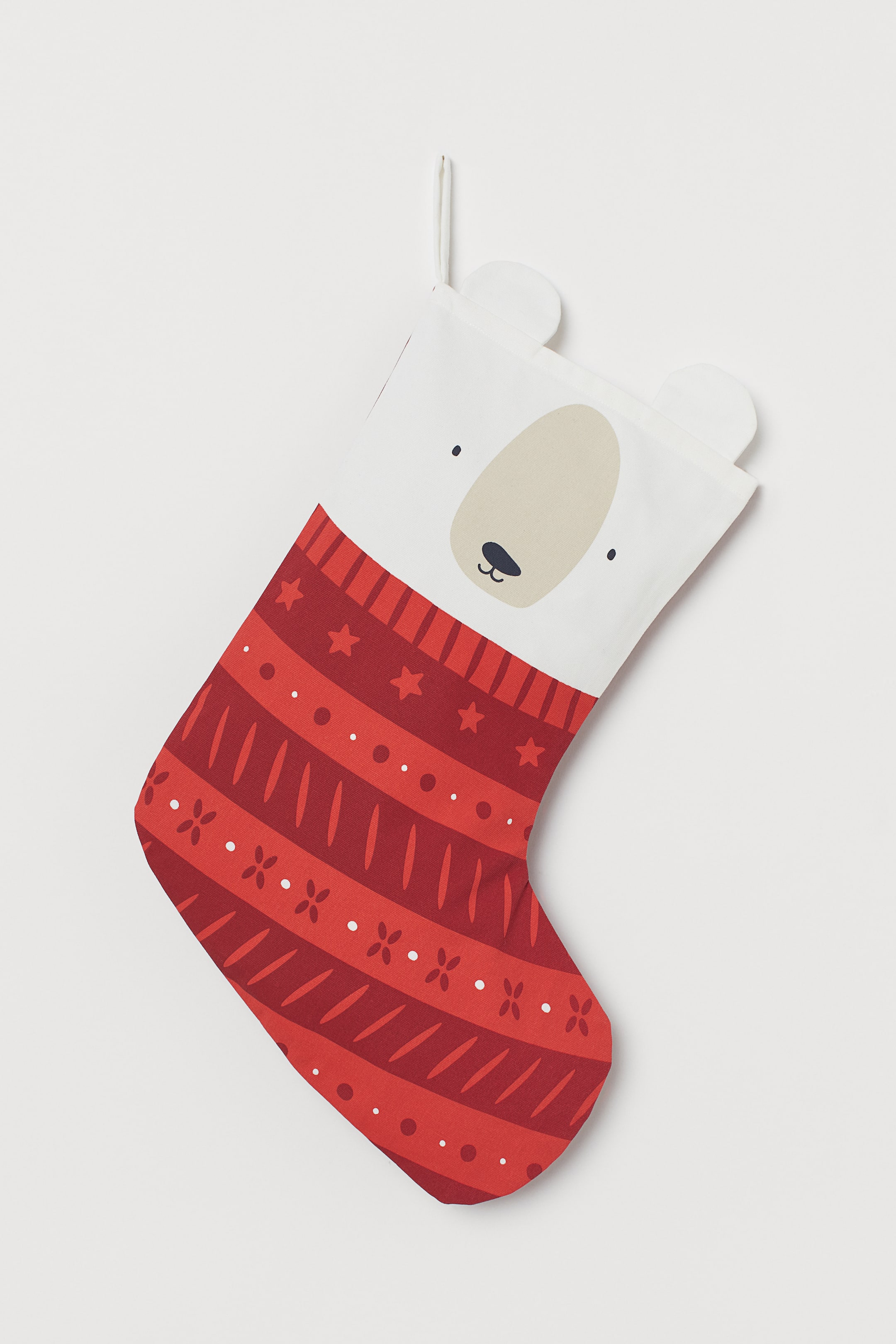 Chaussette de Noël en toile de coton à motif imprimé. Modèle avec ouverture en haut.