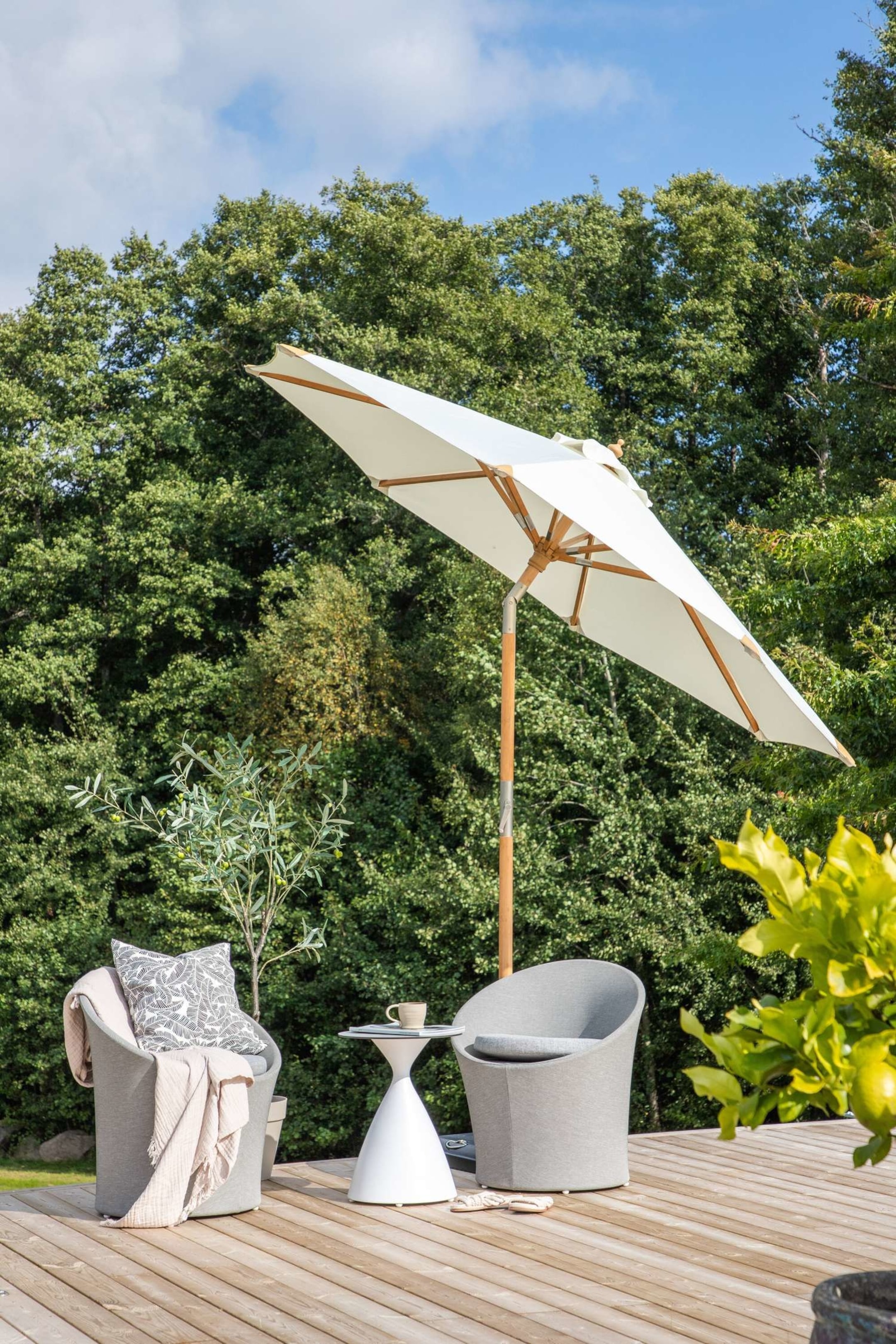 Cerox : un parasol de bon goût et sur pied dans un modèle légèrement plus haut et plus large ! Le tissu est dans une couleur intemporelle et le cadre en bois élégant. Placez-le près du groupe de salle à manger et décidez vous-même quand vous voulez de l'ombre. Parfait à la fois comme protection contre le soleil et comme détail élégant avec le mobilier d'extérieur. Ce parasol peut également être tourné au besoin avec une simple fonction de pliage. Dimensions : Largeur : 270 cm, Profondeur : 270 cm