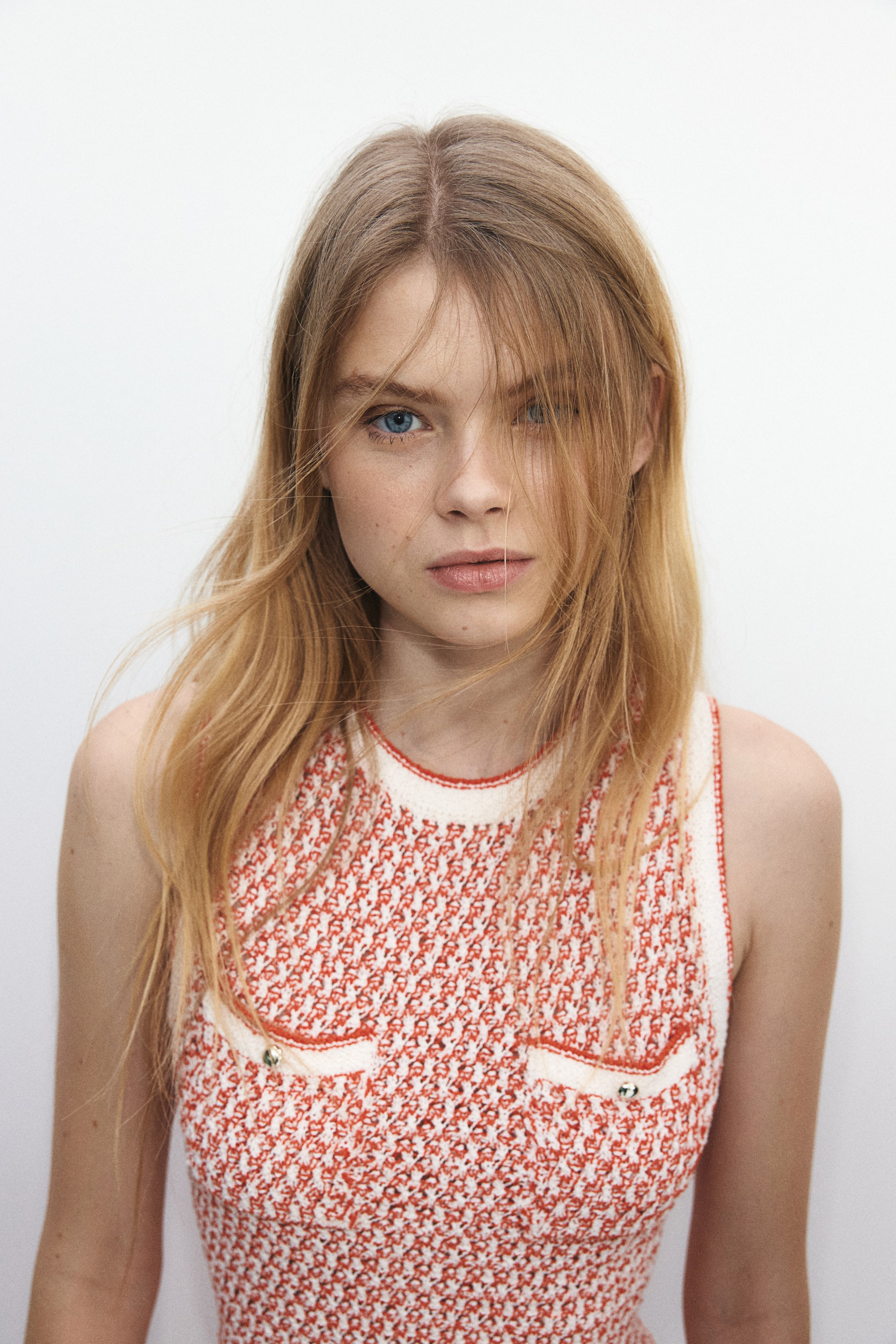 Robe courte et ajustée en maille texturée. Modèle sans manches avec encolure ronde et poches boutonnées sur la poitrine et sur le devant.