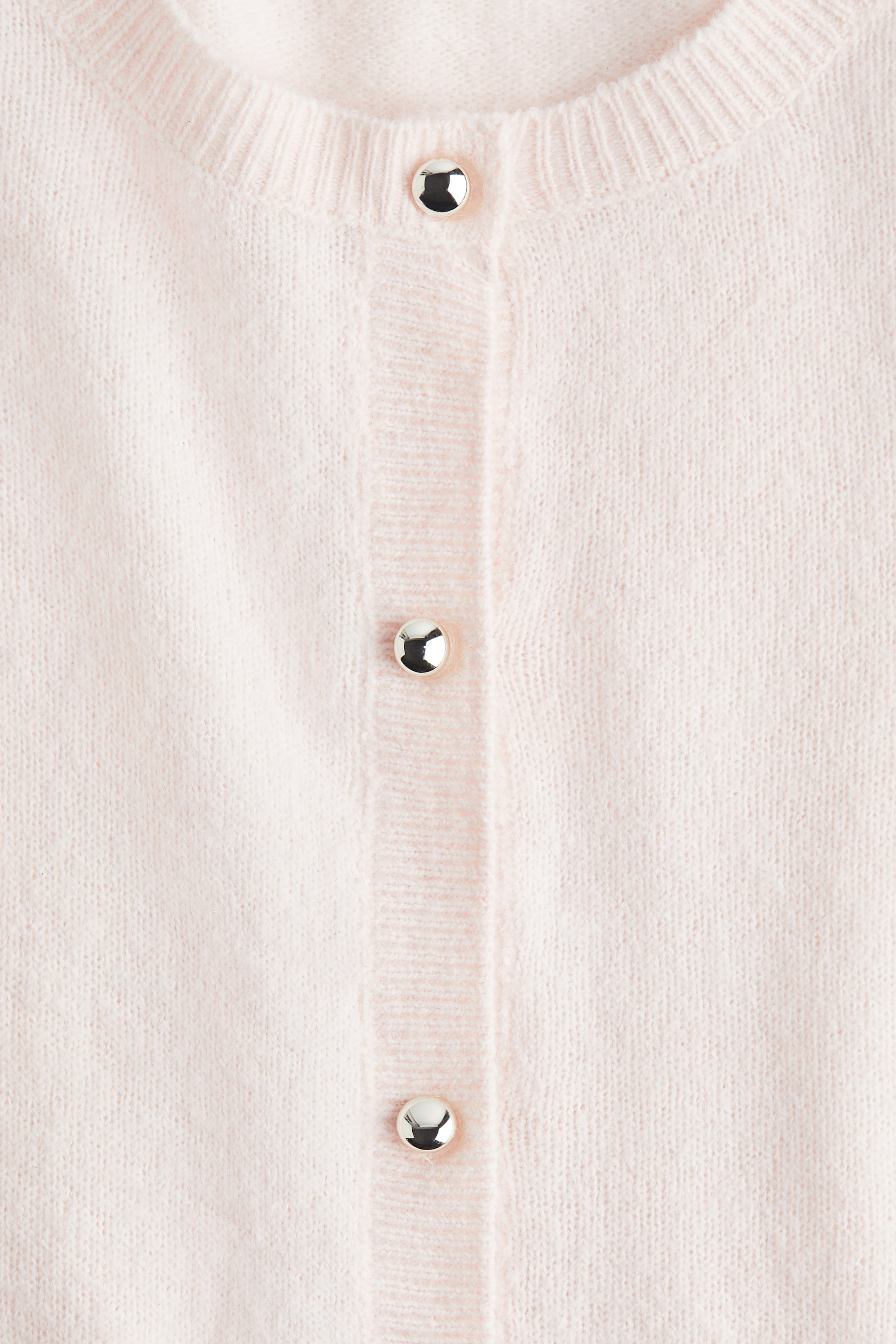 Gilet court et ajusté en maille fine et douce. Modèle à manches courtes avec bande côtelée autour de l'encolure ronde et boutons en métal scintillant devant. Finition côtelée le long de la bande de boutonnage et bord roulotté en bas de manche et à la base.