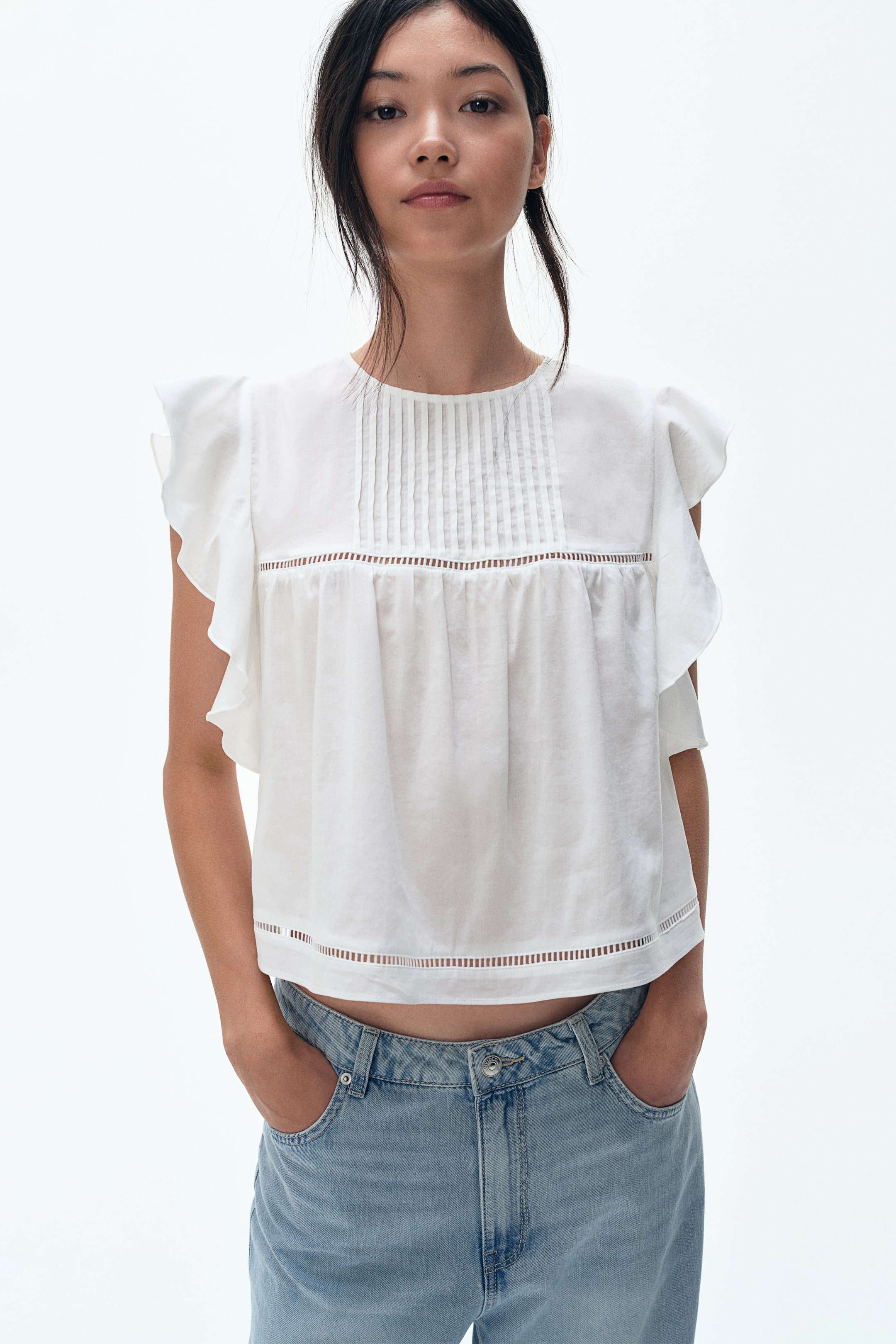 Blouse en tissu aérien de coton et viscose mélangés avec plis nervure sur la poitrine et incrustation de dentelle fine en haut et au-dessus de la base. Modèle à encolure ronde avec manches à volants et fente goutte d'eau surmontée d'un bouton sur la nuque.