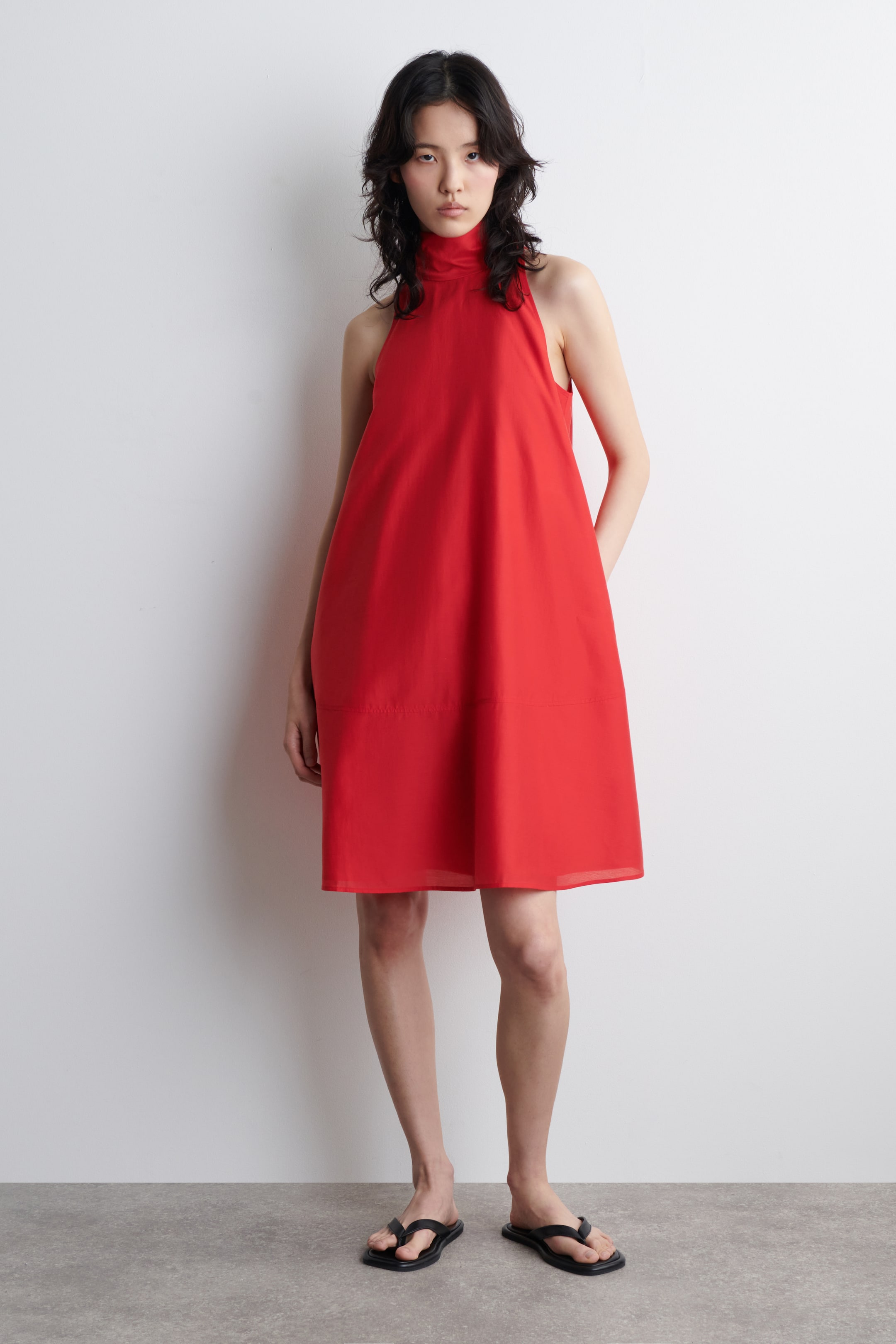 Présentée dans une teinte de rouge vif, cette robe trapèze confectionnée dans un mélange fluide de Lyocell TENCEL™ se distingue par un col drapé avec des liens allongés à l'arrière. Note de style : portez-la avec des kitten heels et des bijoux sculpturaux. Coupe décontractée Fermeture à nouer Le Lyocell TENCEL™ est une fibre régénérée à base de bois, fabriquée à partir de pâte de bois. Elle est produite dans un processus en boucle fermée où les produits chimiques sont réutilisés. Matière, doublure incluse : 88 % Lyocell TENCEL™, 12 % Polyester recyclé. Excluant les finitions / Lavable à la main La longueur dos en taille EU 36 est de 93 cm / Le mannequin porte la taille EU 36