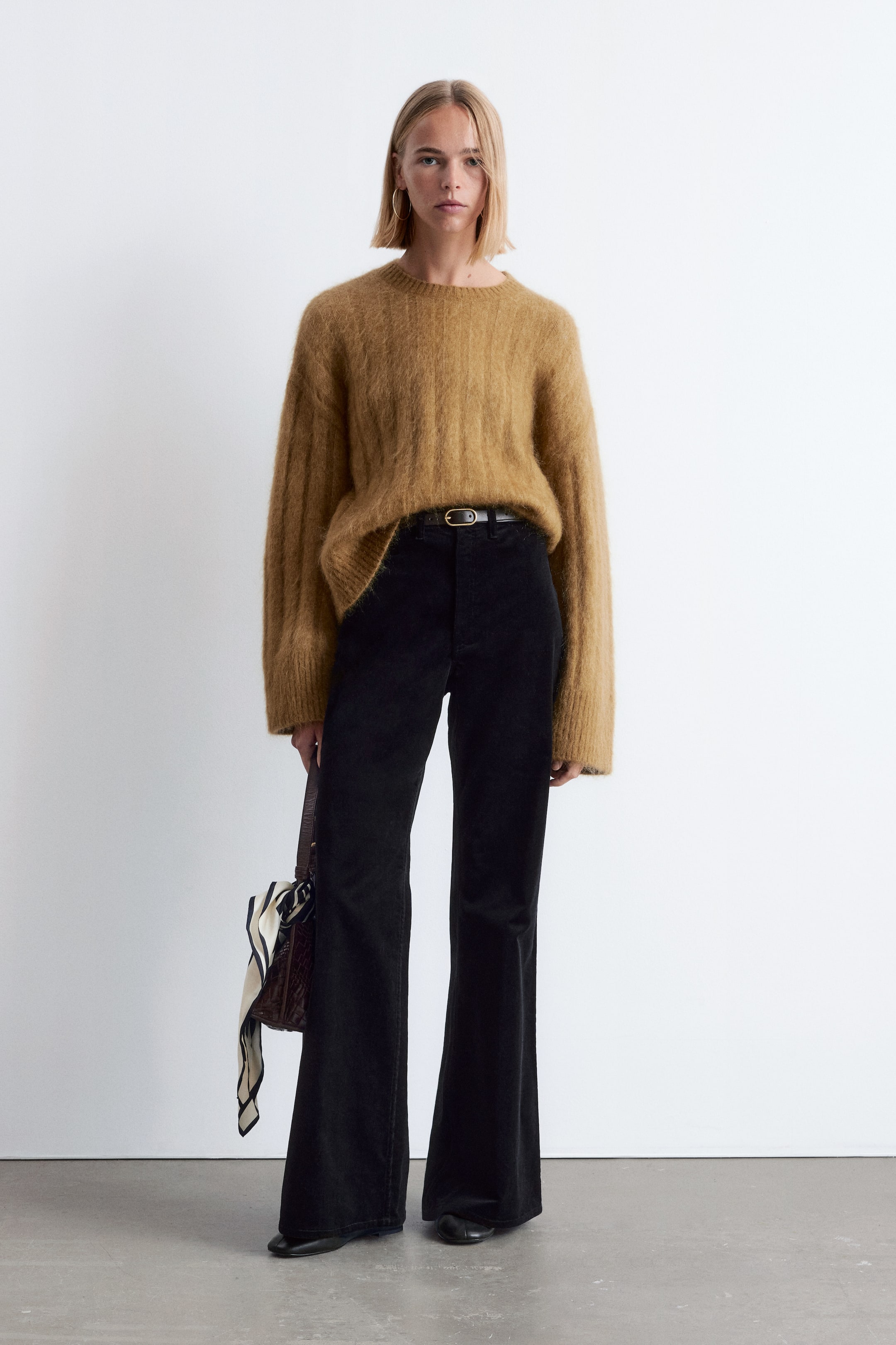 Doté d'une taille haute, ce pantalon long et évasé est confectionné à partir d’un mélange de coton et de velours côtelé, avec une finition extensible et confortable. Il présente une braguette zippée avec fermeture boutonnée et une poche à rabat boutonné à l’avant. On distingue deux poches plaquées à l’arrière. Longueur de l’entrejambe : 83,6 cm (EU 36 / UK 8 / US 4)