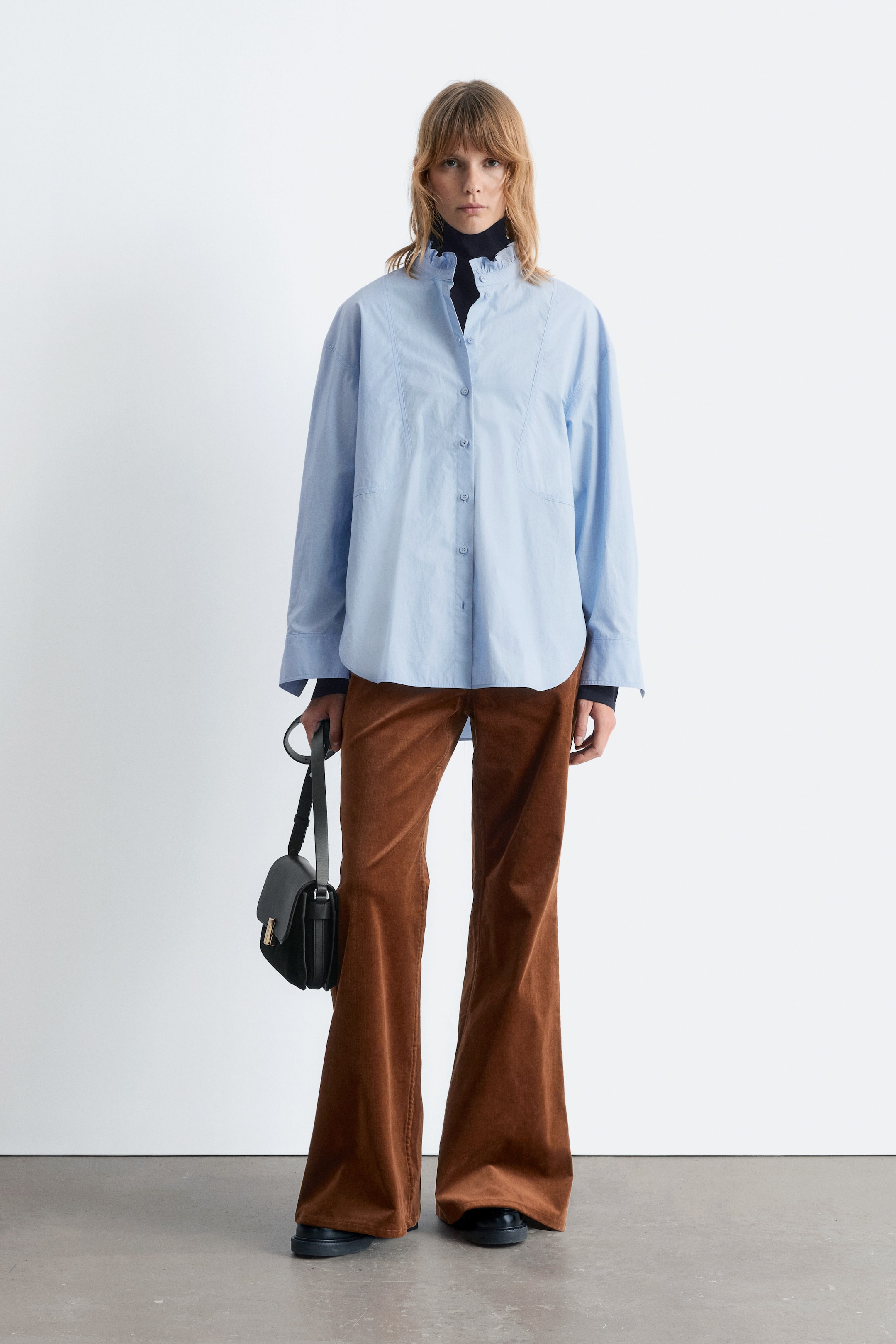 Doté d'une taille haute, ce pantalon long et évasé est confectionné à partir d’un mélange de coton et de velours côtelé, avec une finition extensible et confortable. Il présente une braguette zippée avec fermeture boutonnée et une poche à rabat boutonné à l’avant. On distingue deux poches plaquées à l’arrière. Longueur de l’entrejambe : 83,6 cm (EU 36 / UK 8 / US 4)