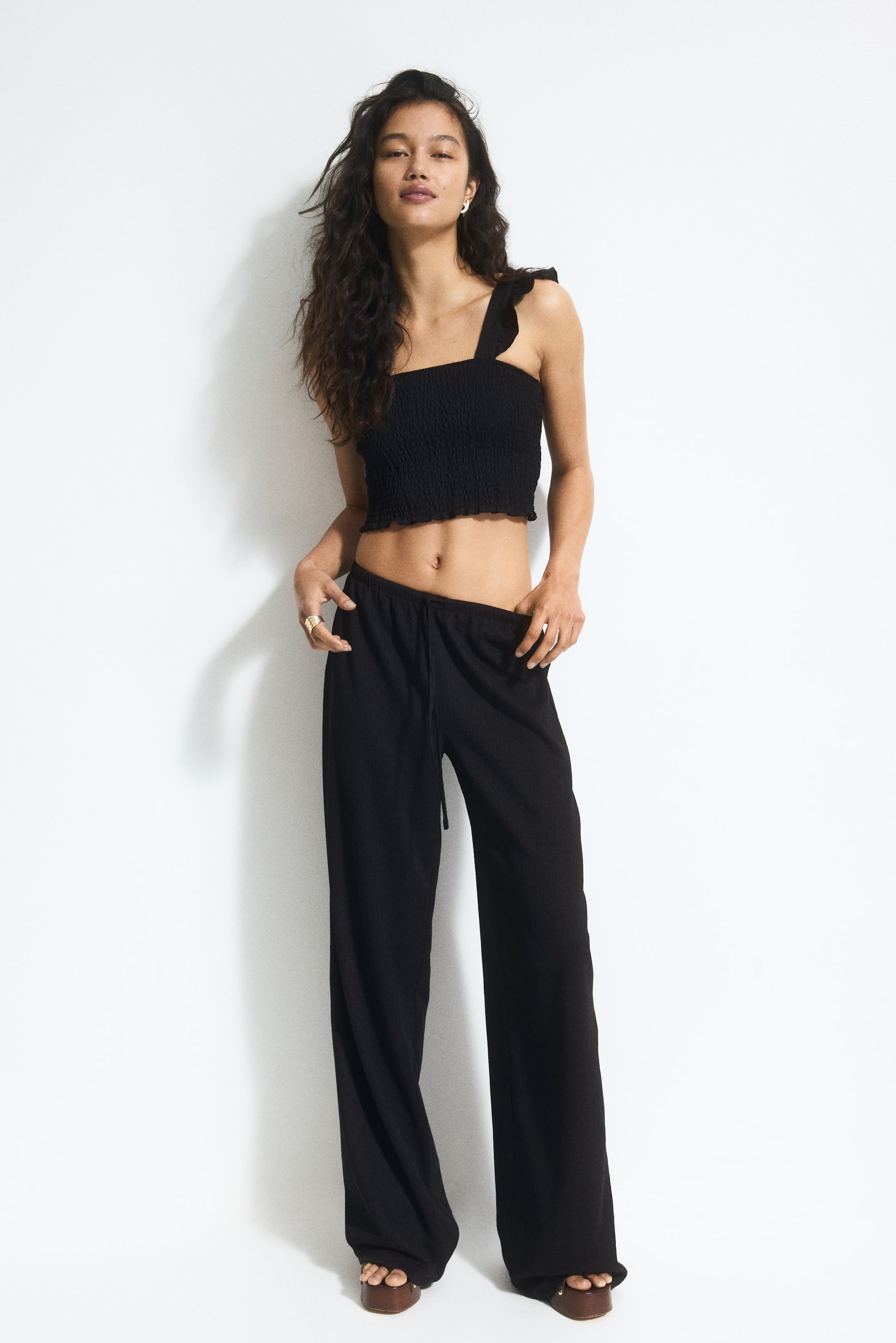 Top court et ajusté en jersey smocké. Modèle avec bretelles à bord à volant.