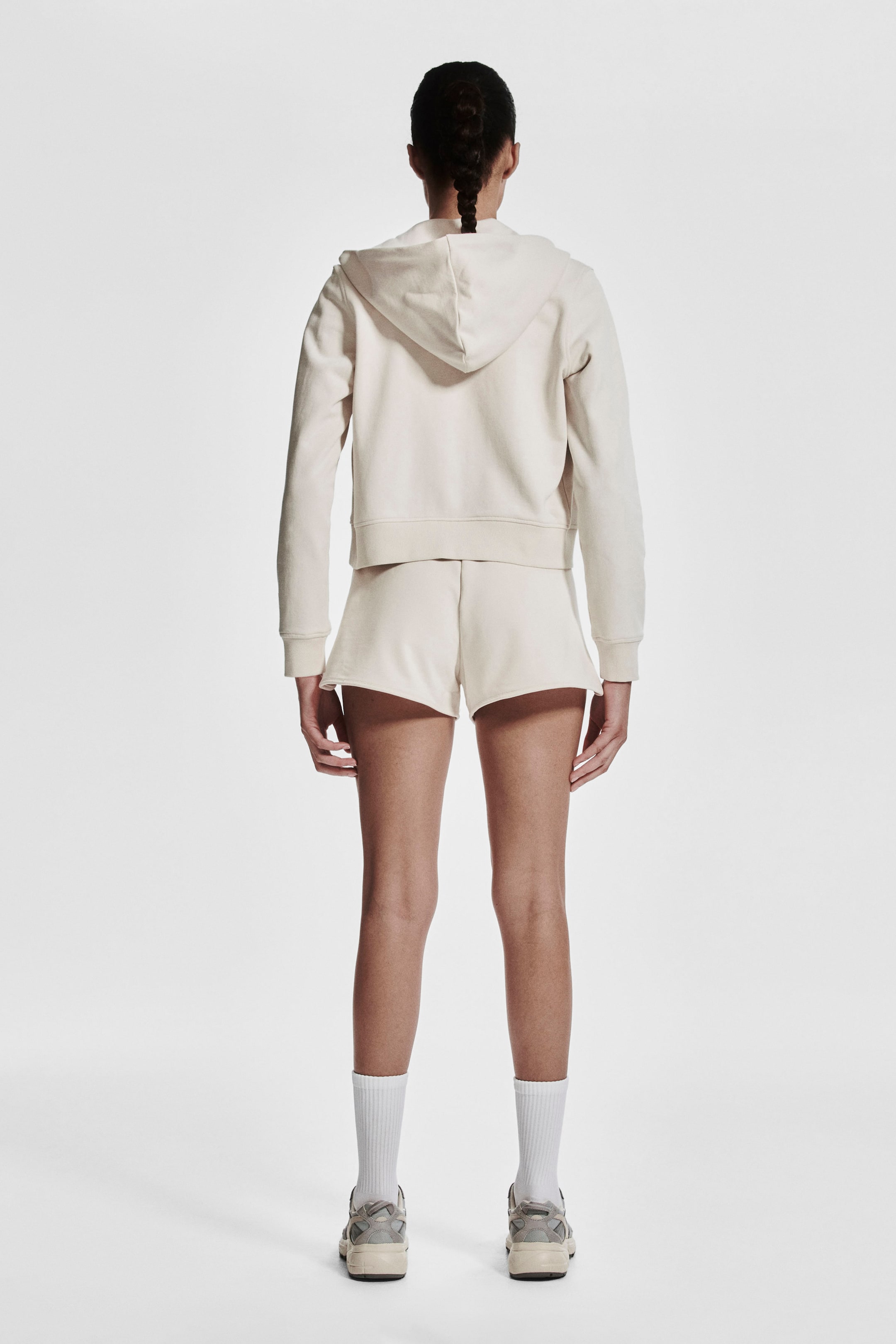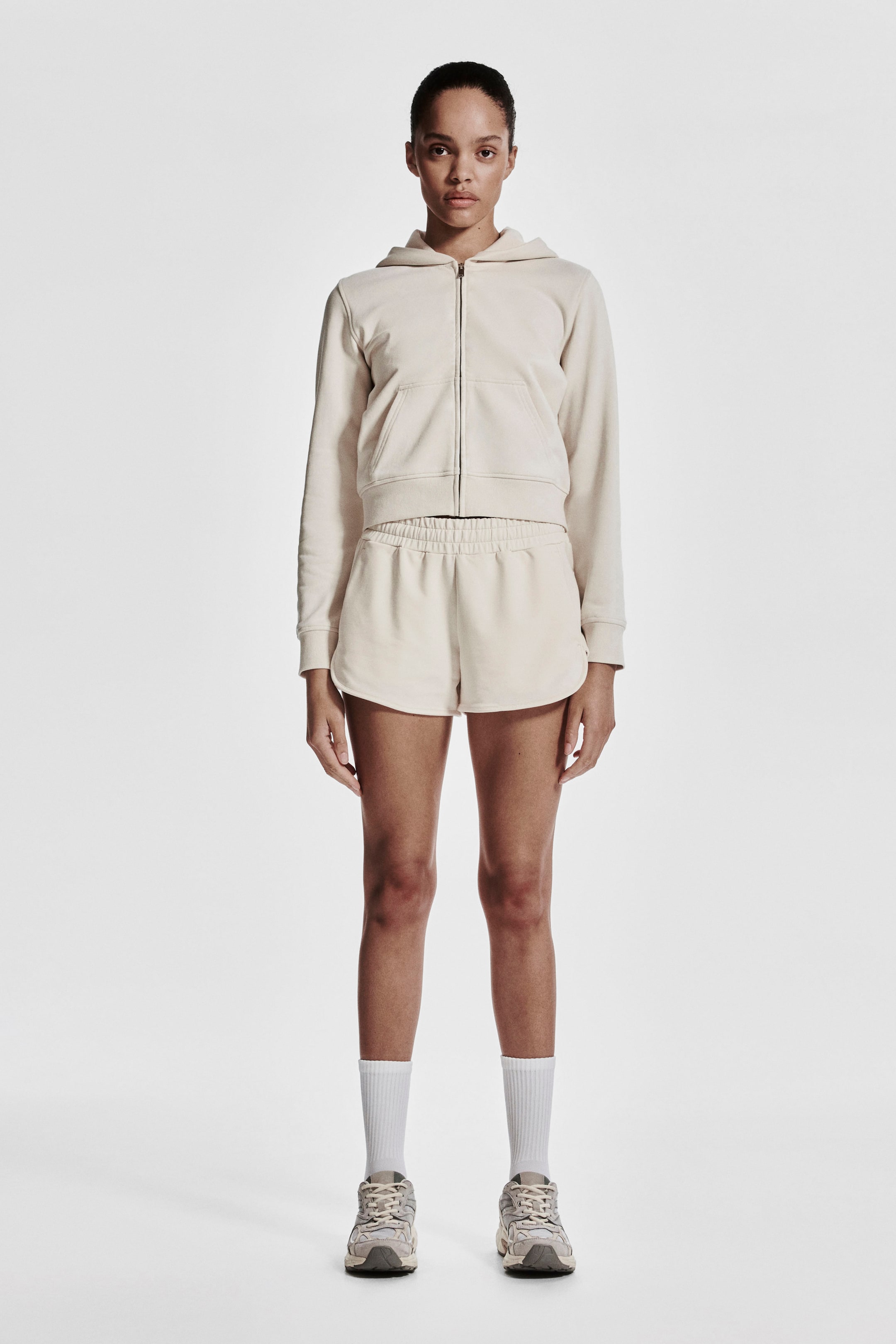 Veste de sport courte en molleton de coton. Coupe classique avec capuche, manches longues et fermeture à glissière devant. Poches obliques devant. Finition bord-côte aux poignets et à la base.
