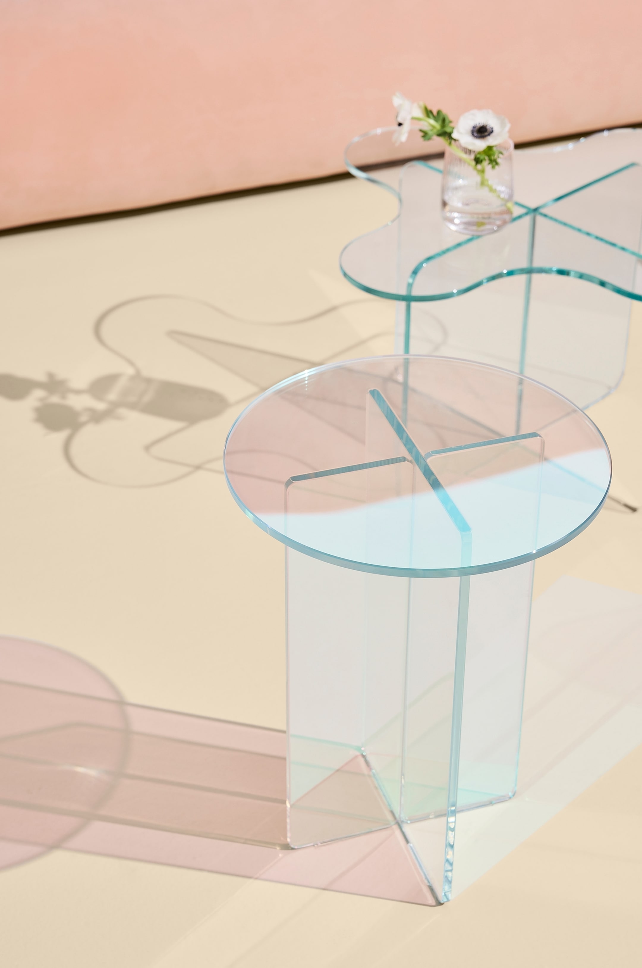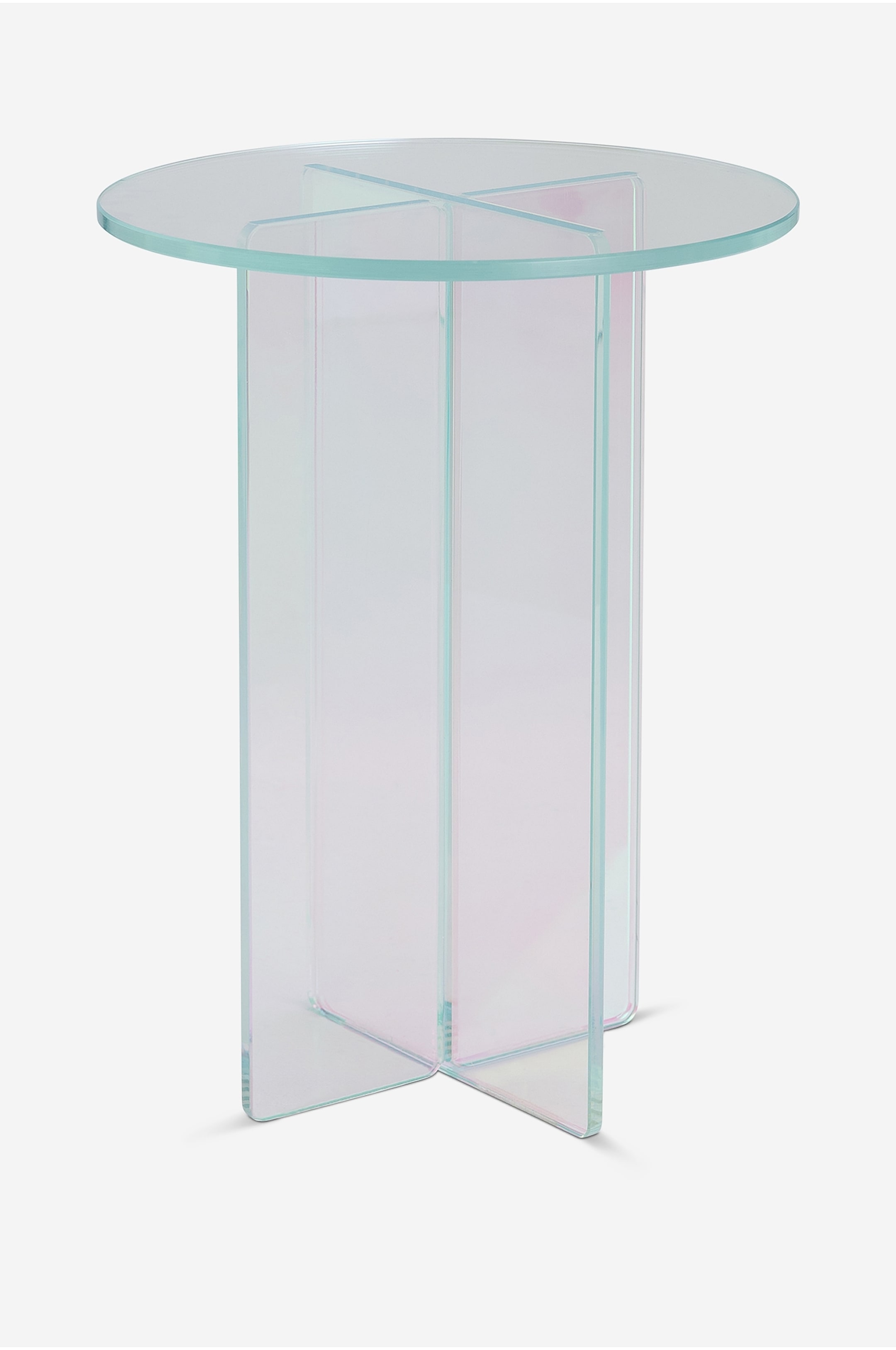 Iris est une petite table d'appoint avec plateau en verre et base en croix. Le verre présente des reflets holographiques aux couleurs de l'arc‑en‑ciel. Iris est un détail décoratif qui apporte une note de fraîcheur à votre intérieur. Verre de 10mm d'épaisseur. Hauteur : 45 cm. Diamètre : 35 cm. Livrée montée.