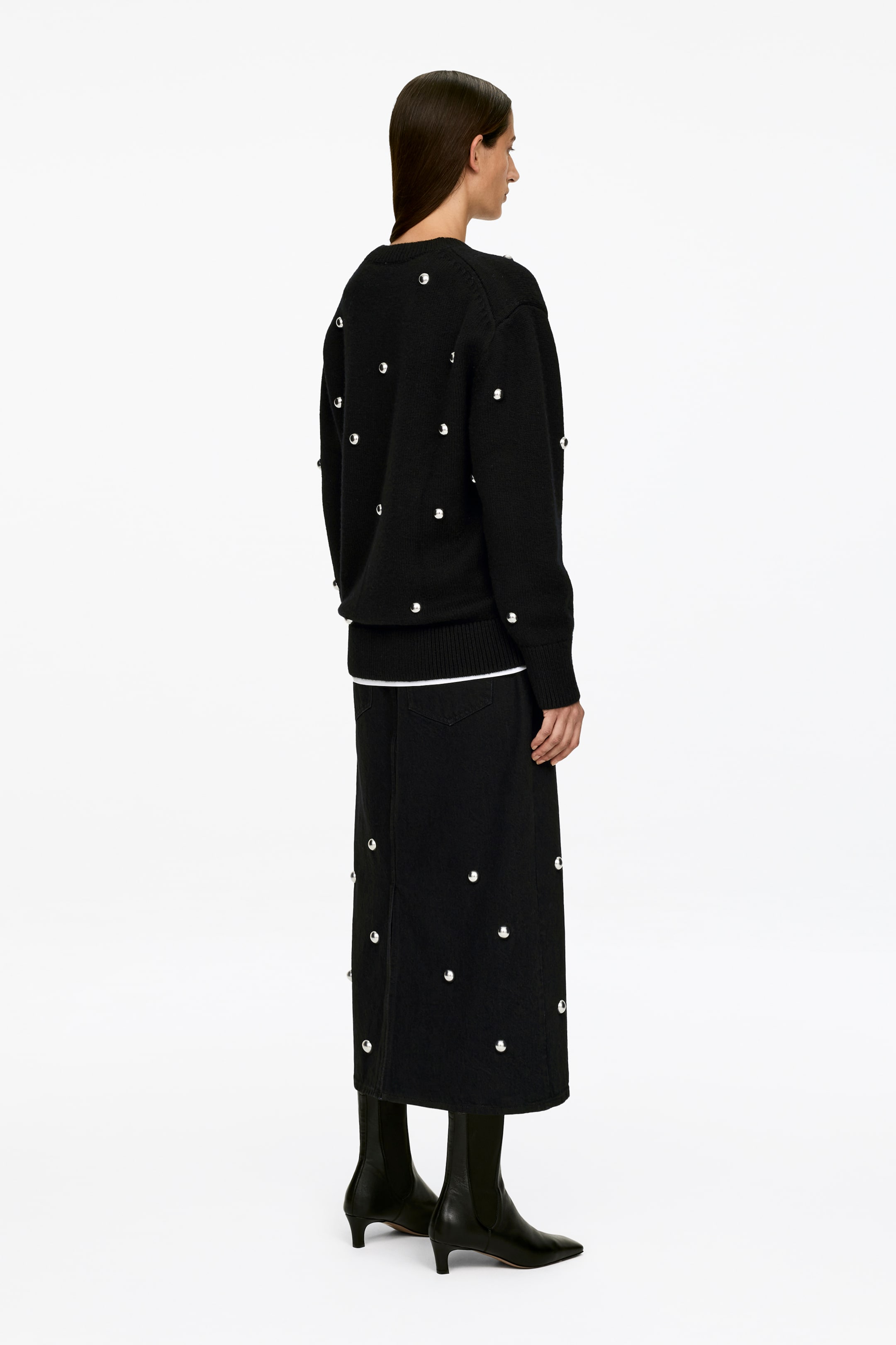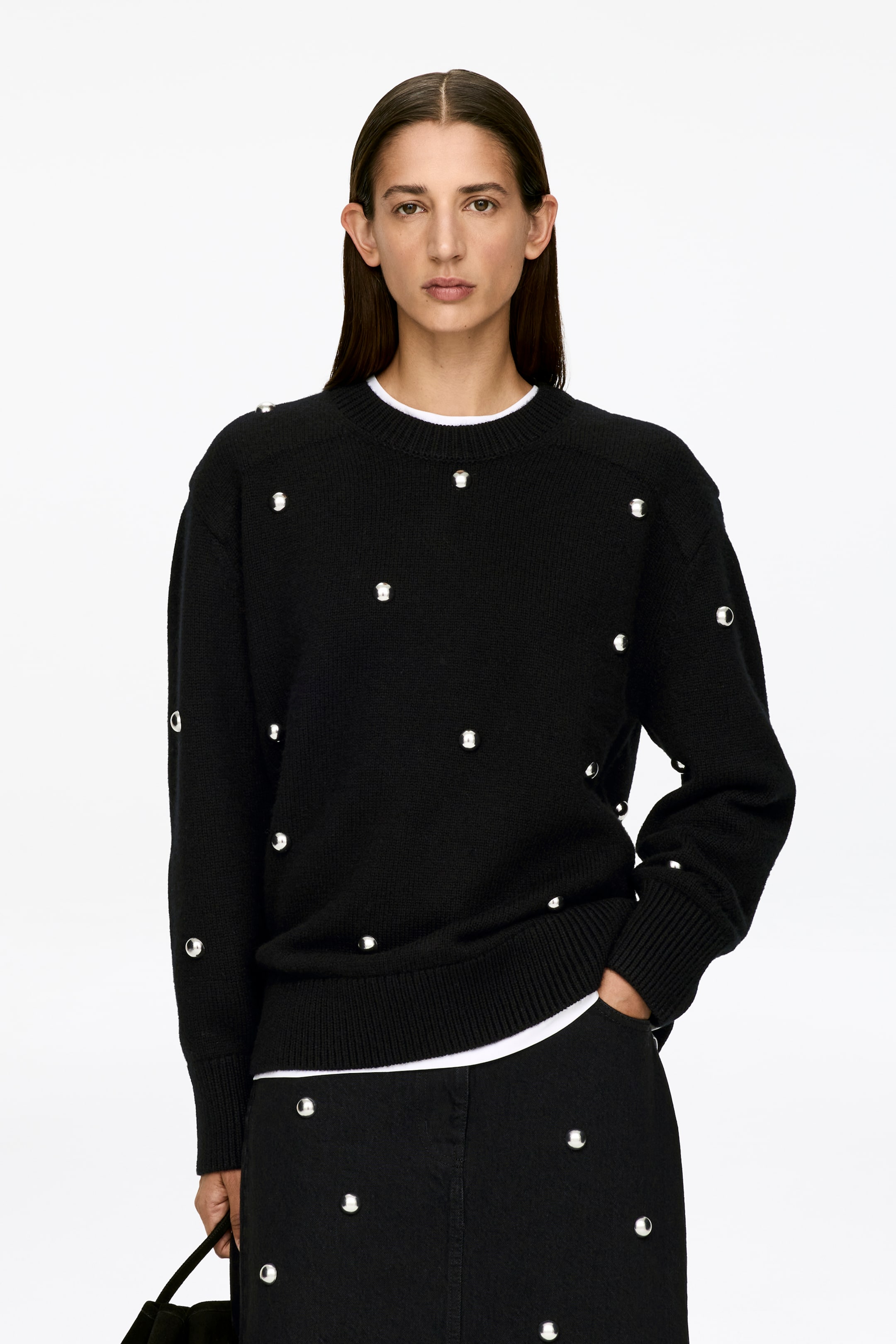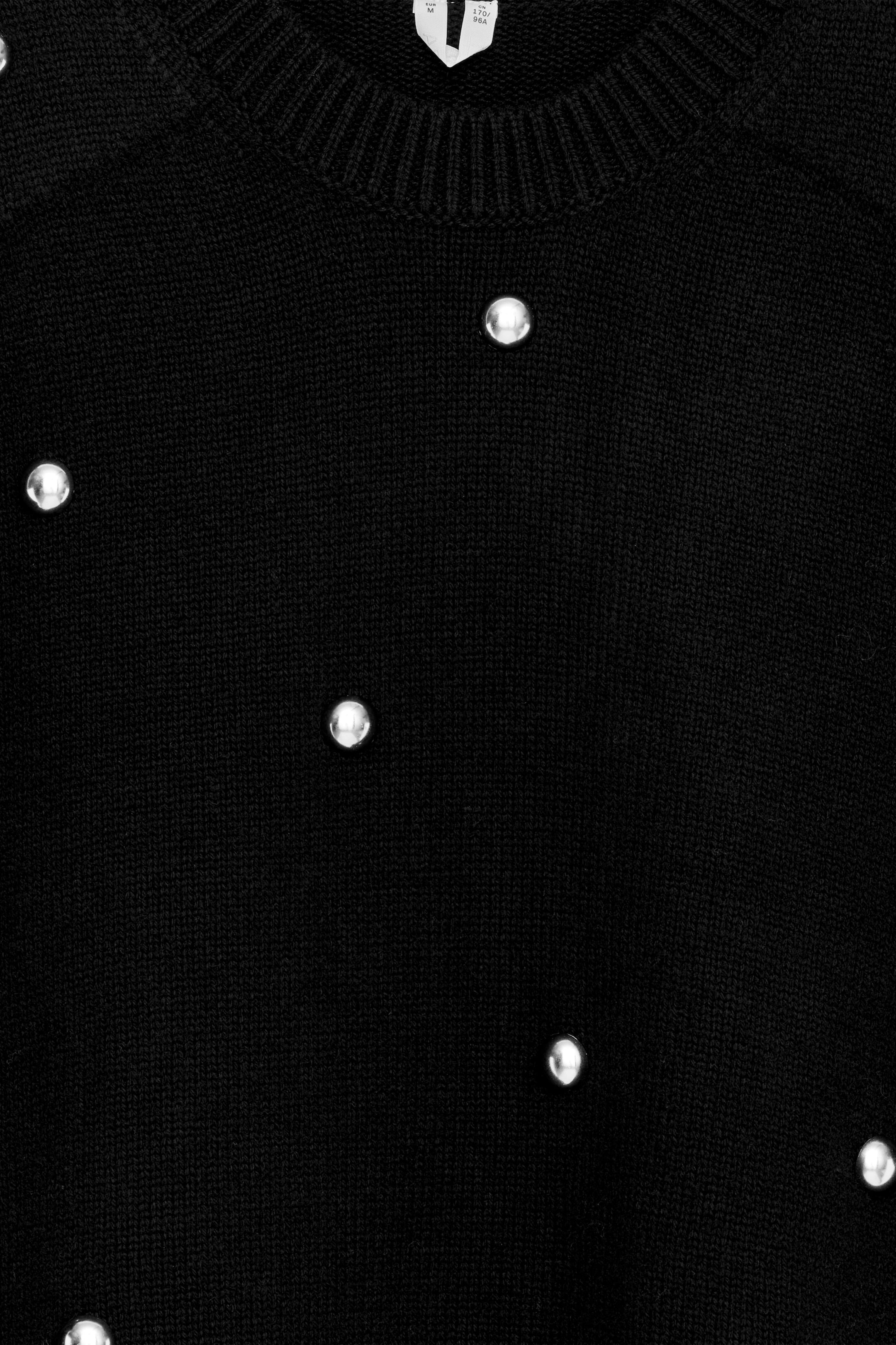 Pull à col rond confectionné en pure laine. Il est agrémenté de bordures côtelées et de clous décoratifs argentés.