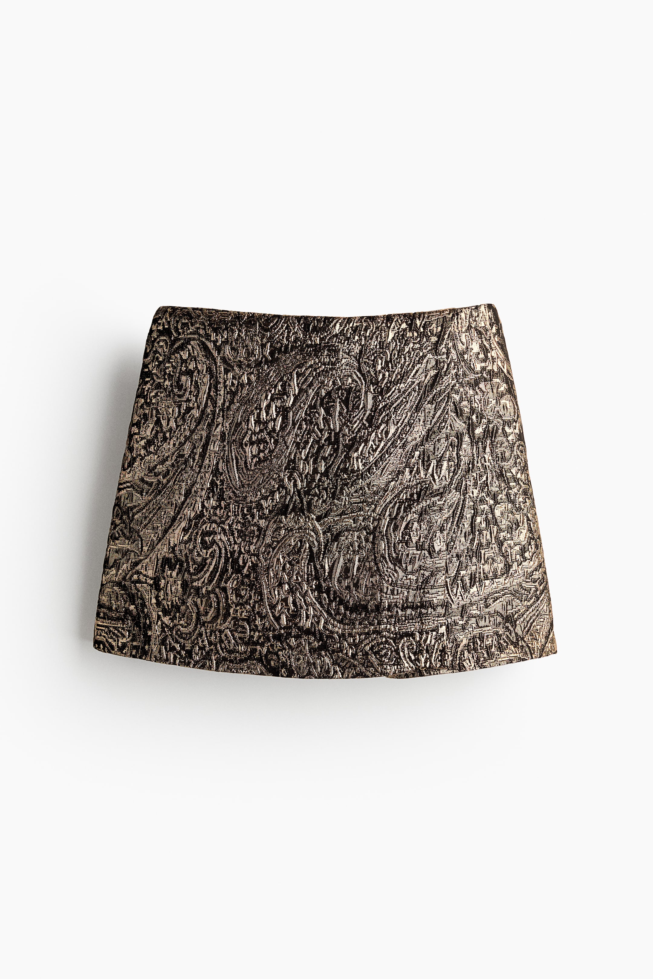 Jupe-short courte en tissu jacquard brillant. Modèle taille haute avec fermeture par agrafe et zip dissimulés sur un côté. Doublée d'un short.