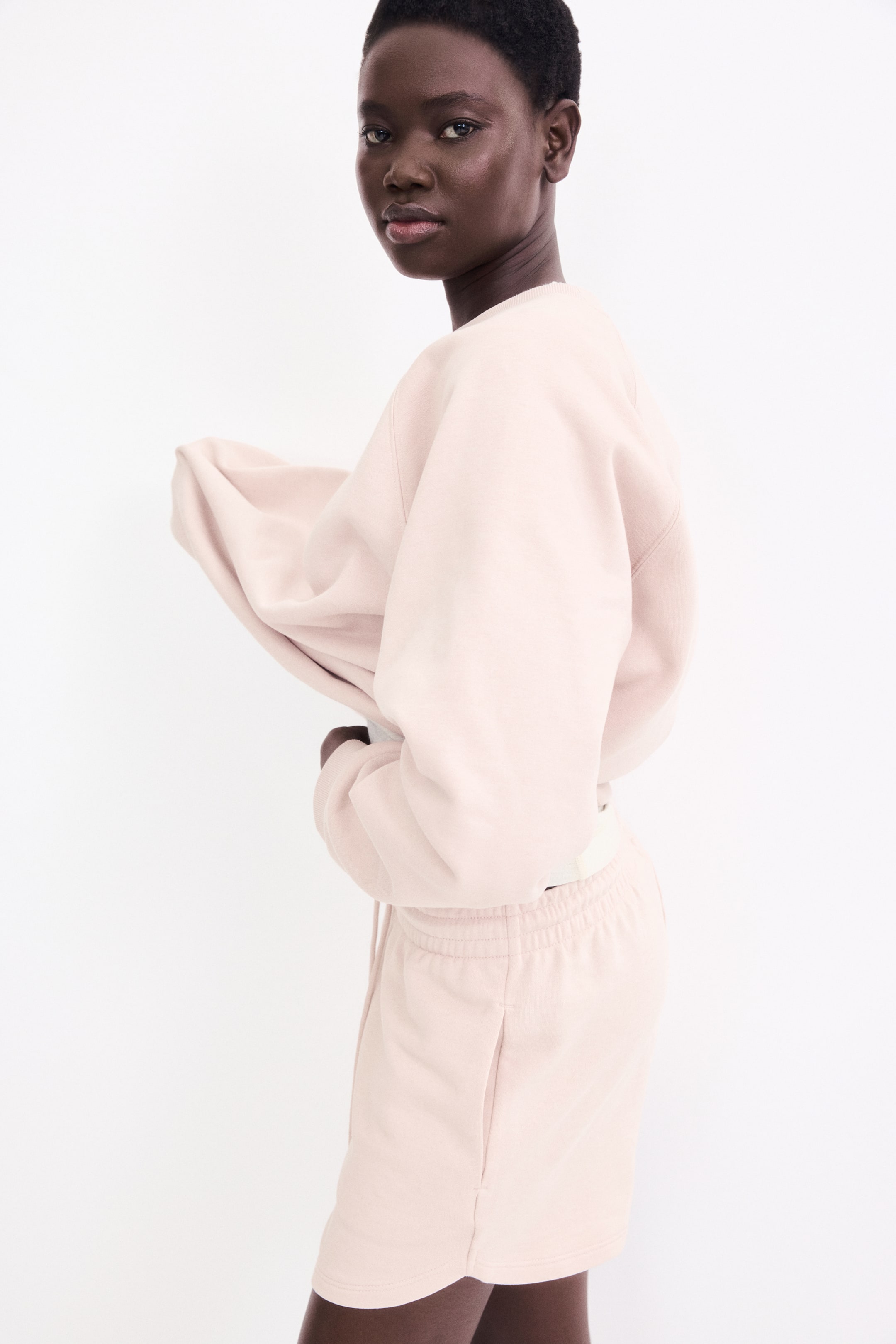 Short en molleton léger de coton mélangé. Modèle avec élastique habillé et lien de serrage à la taille. Poches couture discrètes.