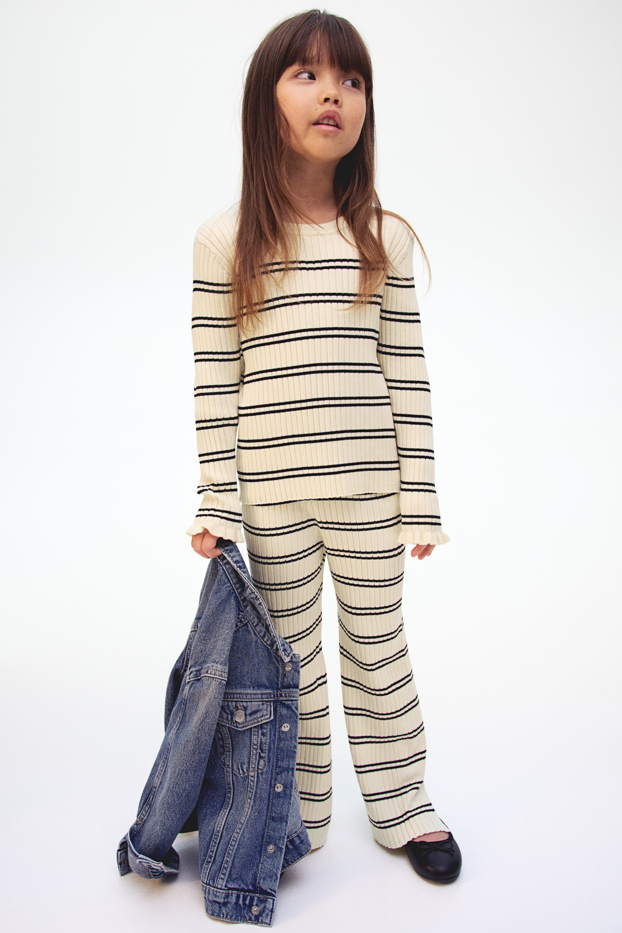 Pantalon en fine tricot côtelé de viscose mélangée. Modèle avec élastique habillé à la taille et bas de jambe évasé.