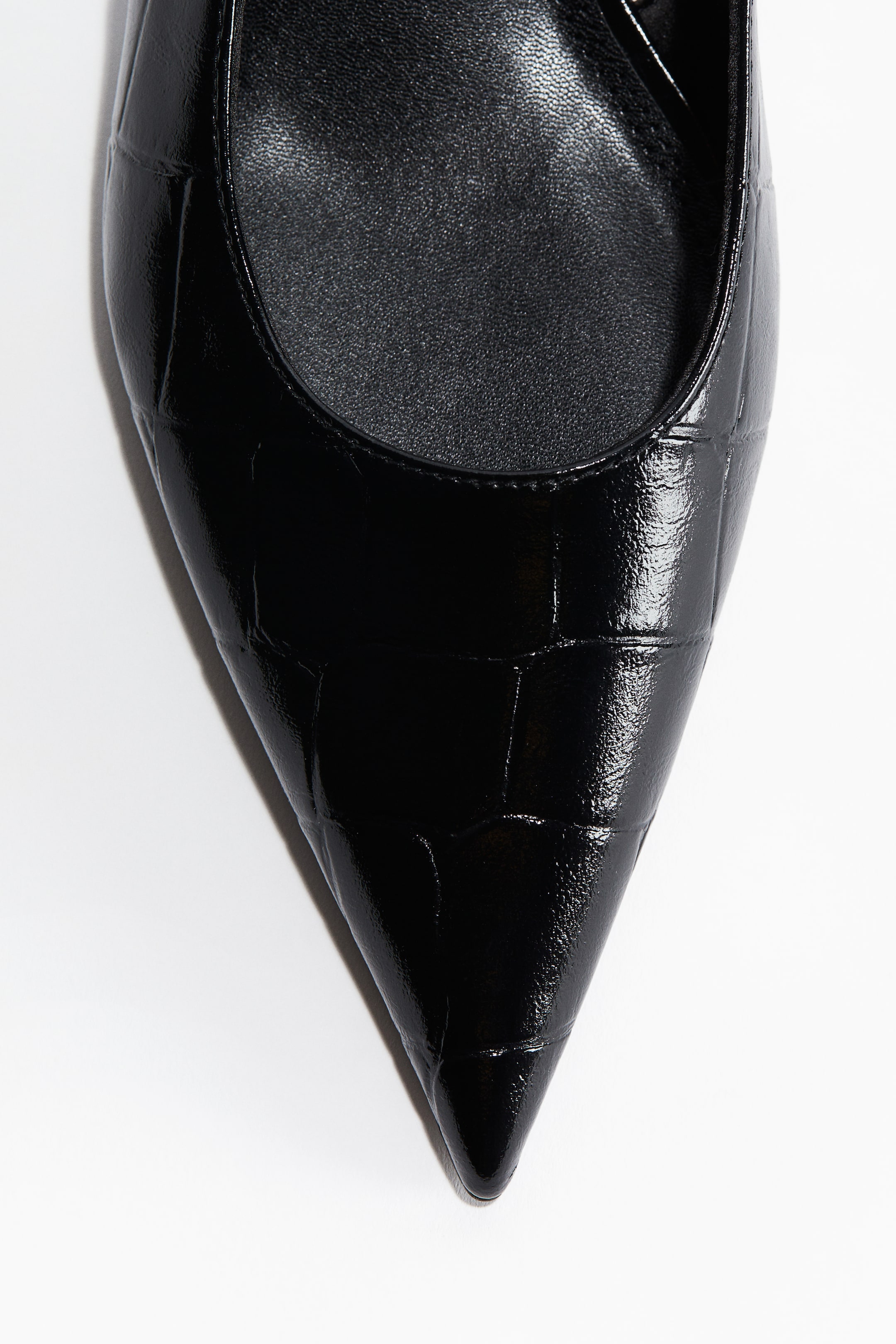 Escarpins en tissu enduit avec petit talon. Modèle à bout pointu et fine bride arrière munie d'un élastique sur un côté. Doublure en satin.