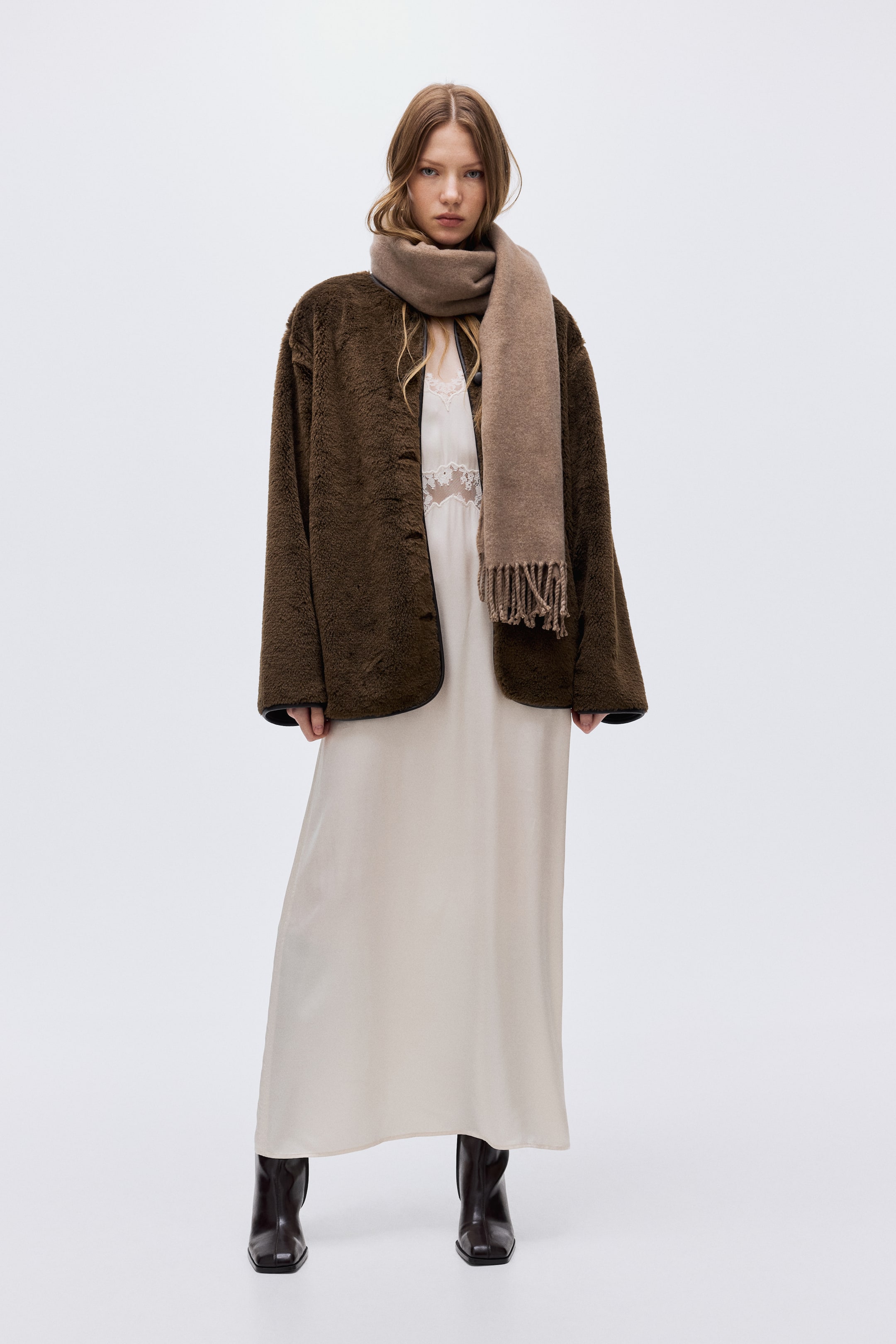 Veste en doux polar avec biais en tissu enduit. Coupe ample avec encolure ronde et boutonnage devant. Emmanchures tombantes et manches longues. Poches latérales discrètes. Doublée.