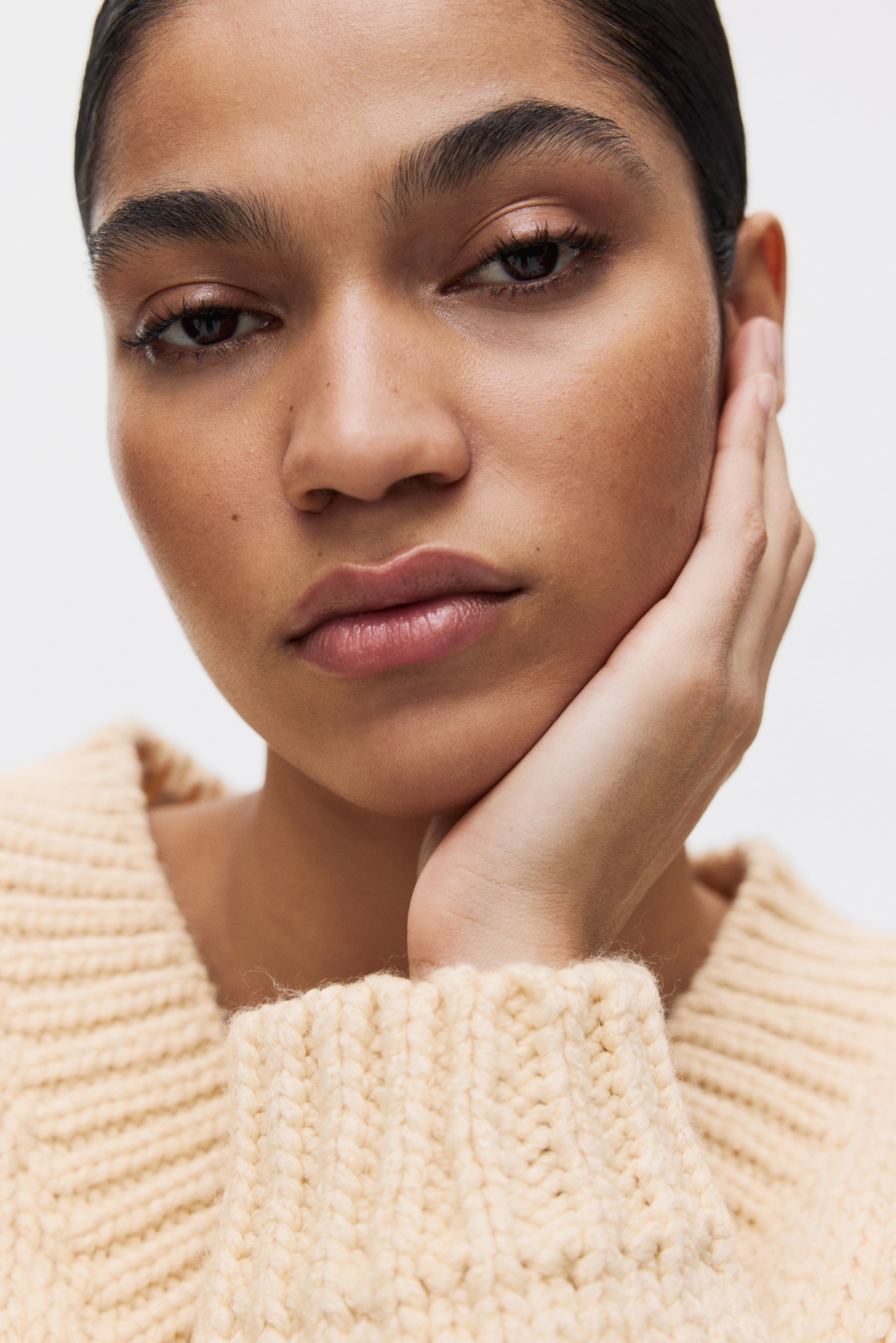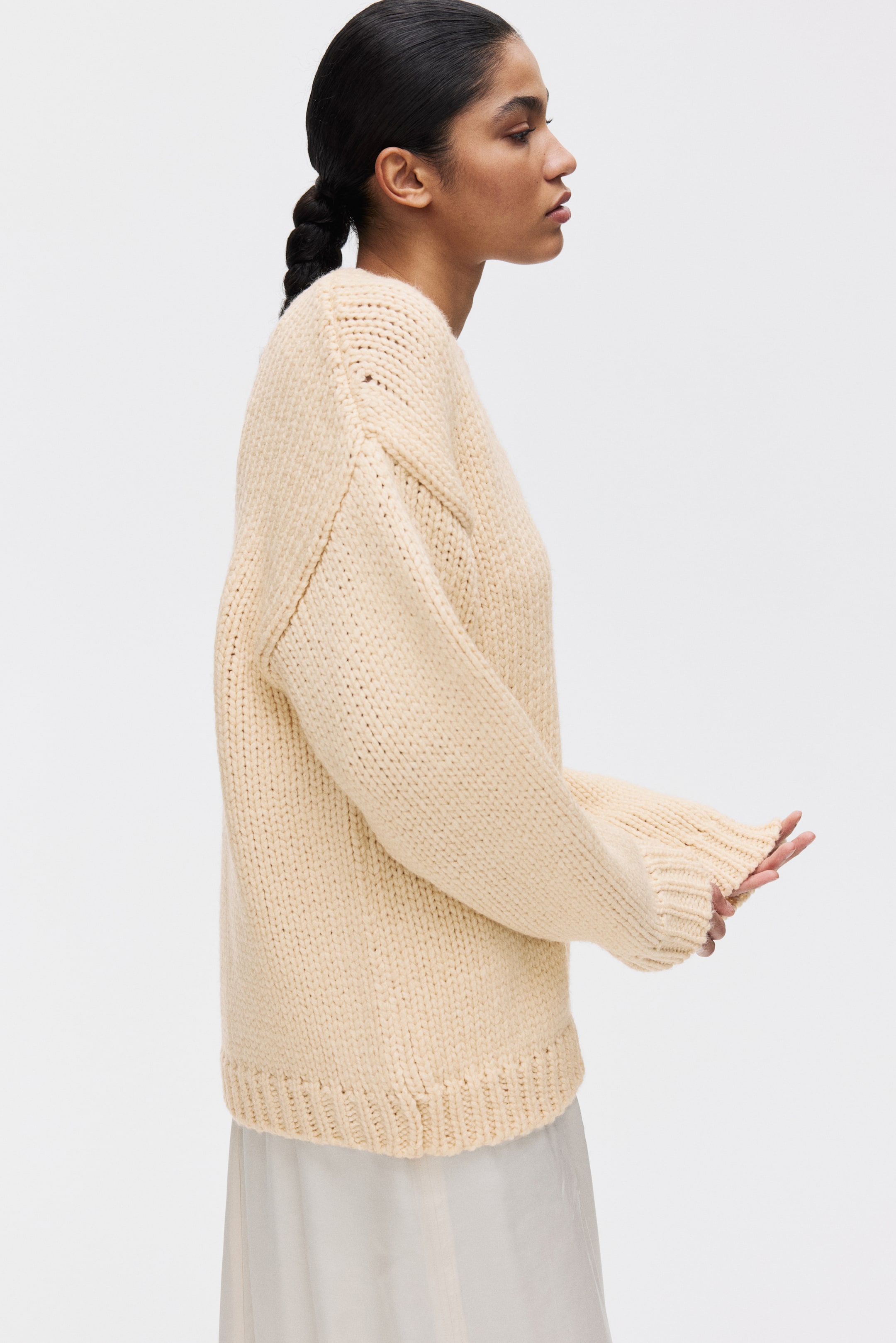 Chandail en tricot épais enrichi d'une touche de laine. Modèle avec bande côtelée autour de l'encolure en V, emmanchures descendues et manches longues. Finition côtelée aux poignets et au bas.