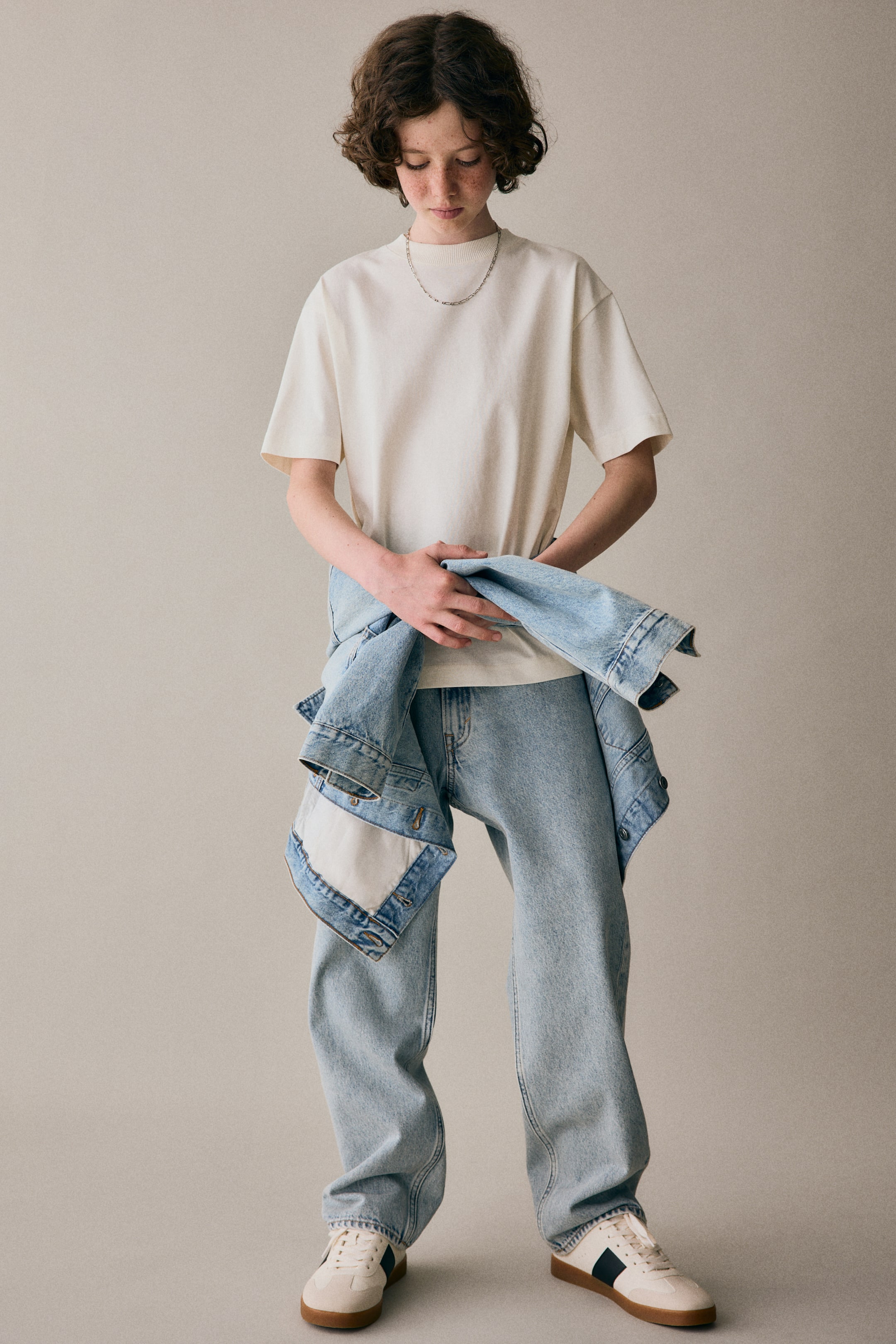 Jean 5 poches en denim de coton lavé. Coupe flottante avec élastique réglable à la taille et braguette zippée surmontée d'un bouton. Jambes droites.