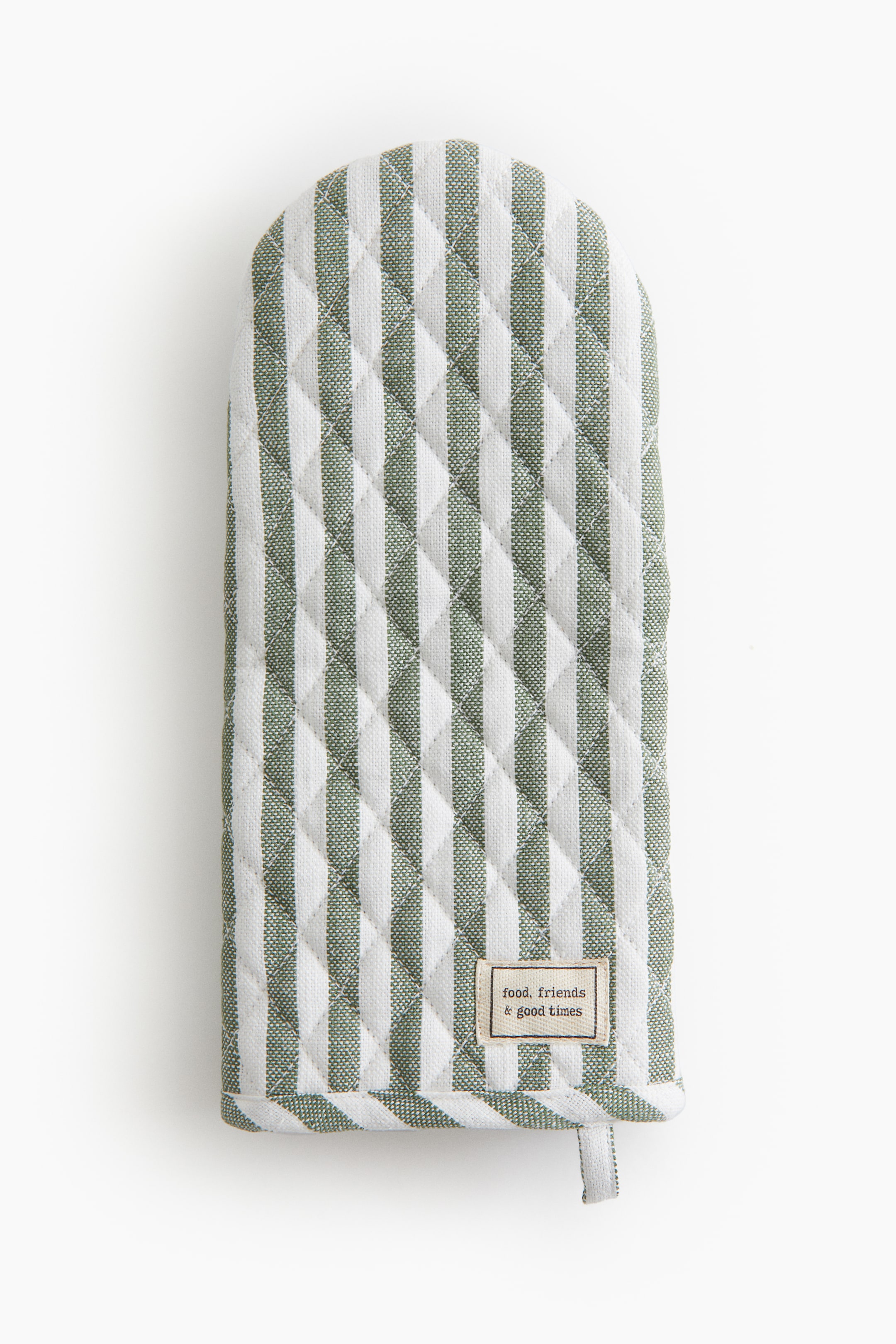 Gant de cuisine matelassé en tissu de coton et lin mélangés. Modèle avec petite application agrémentée d'un texte imprimé et boucle de suspension dans un angle. Doublé.