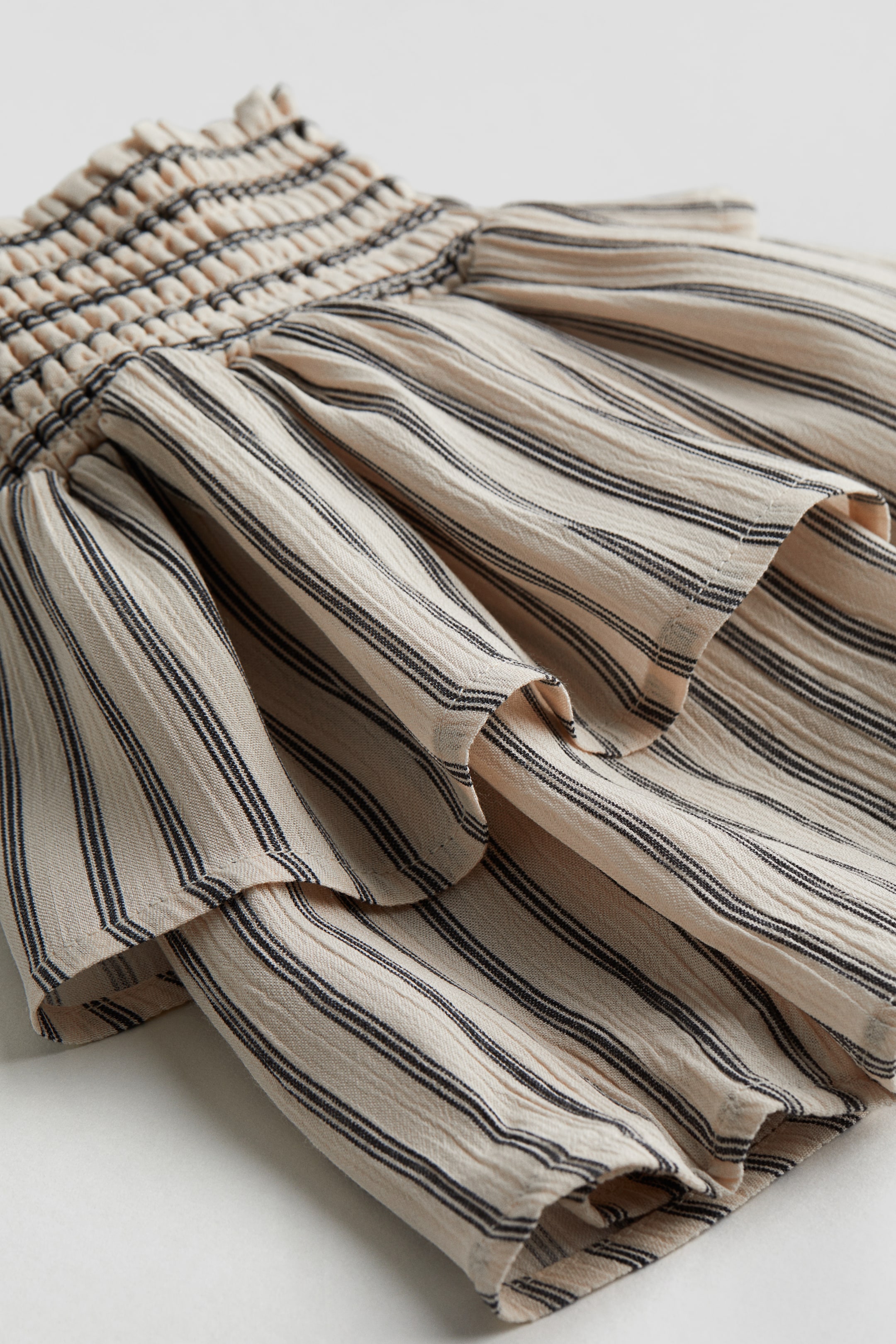 Jupe en matière tissée avec deux volantés étagés. Modèle avec large partie smockée à la taille.