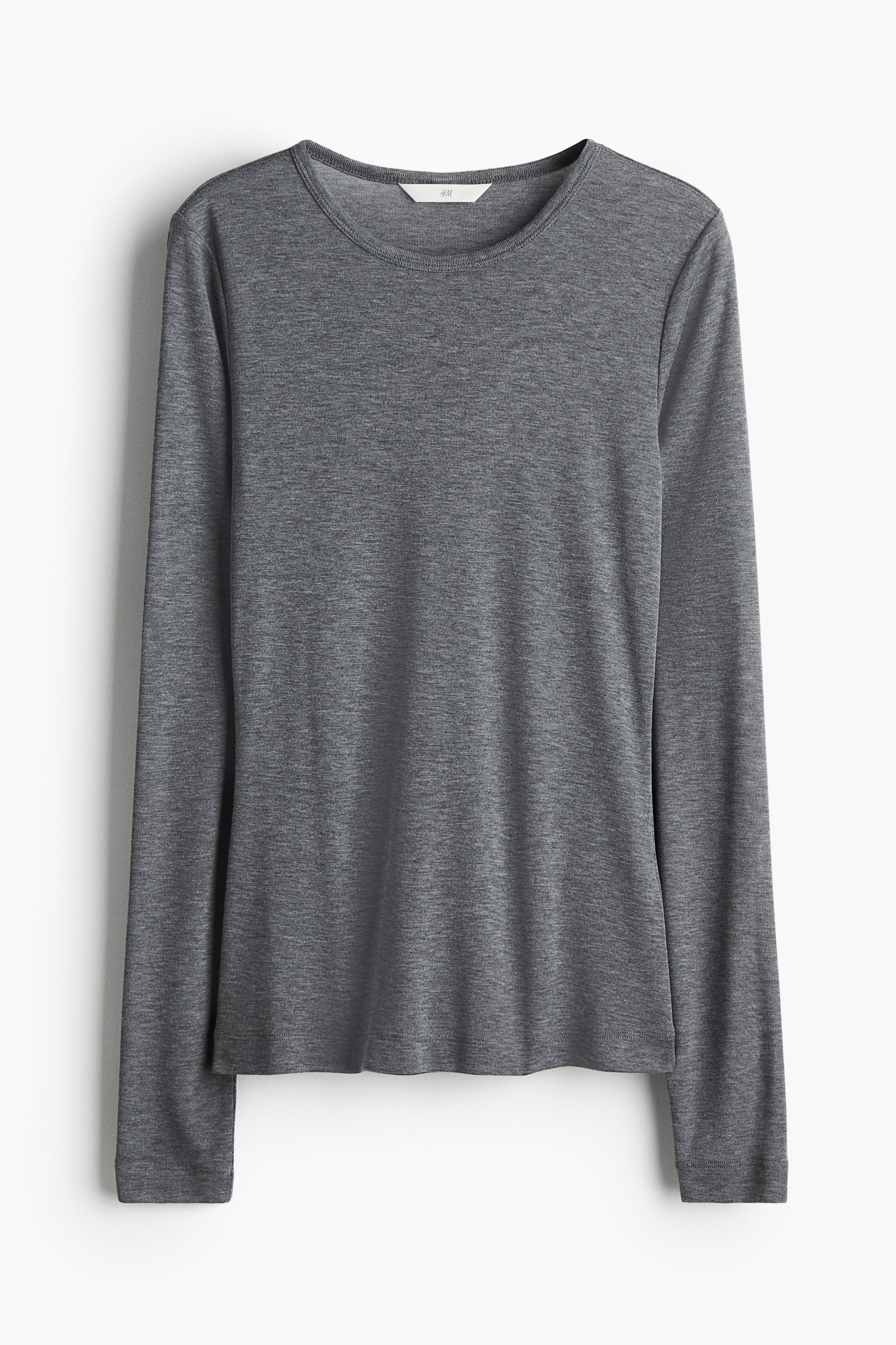 Top en jersey souple et côtelé, enrichi d'une touche de laine. Modèle ajusté avec encolure ronde et manches longues.