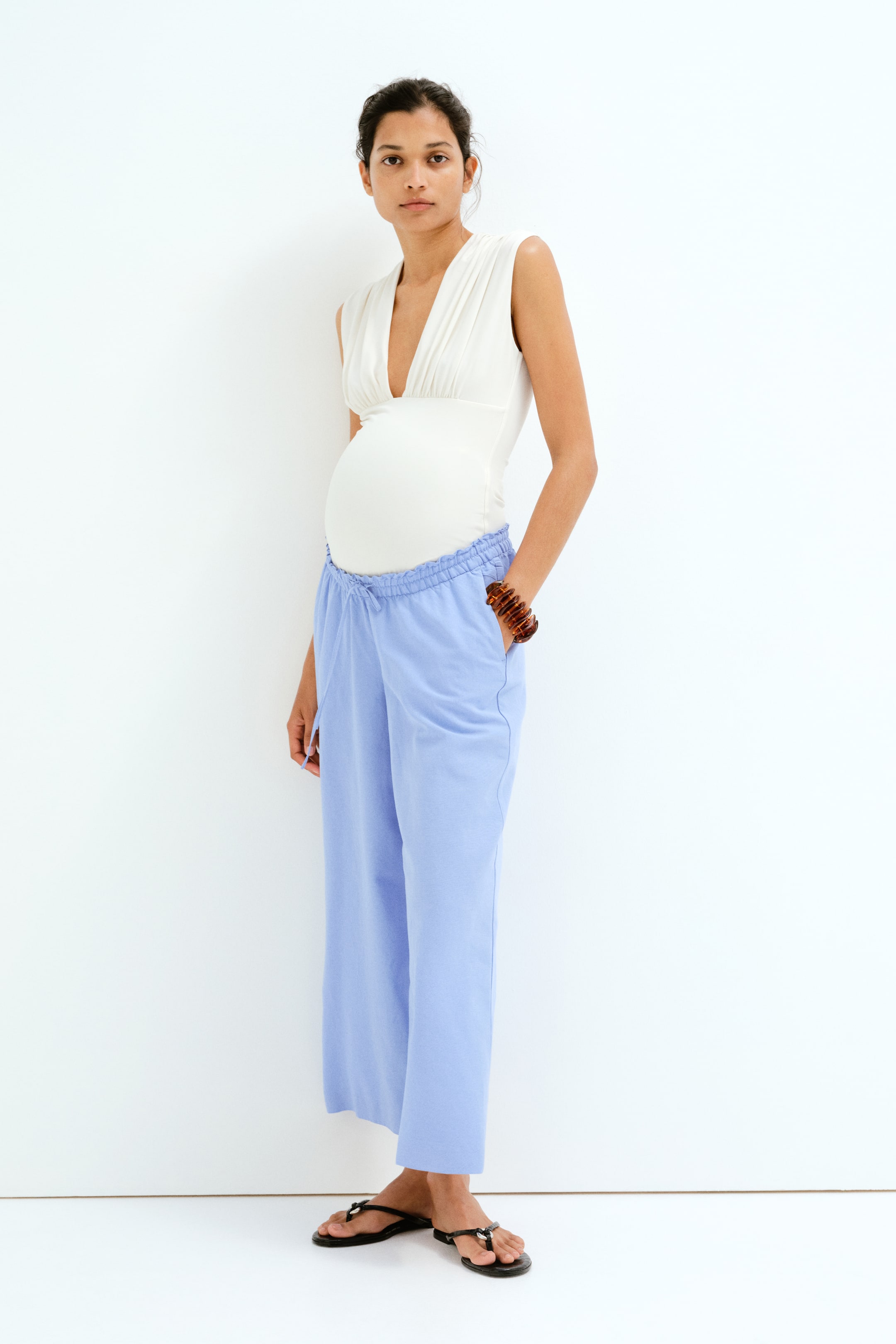 Pantalon en tissu aérien de lin mélangé. Coupe flottante avec taille basse soulignée par élastique smocké et petit cordon de serrage. Poches italiennes. Jambes larges, de longueur cheville. À utiliser aussi bien durant la grossesse que par la suite.