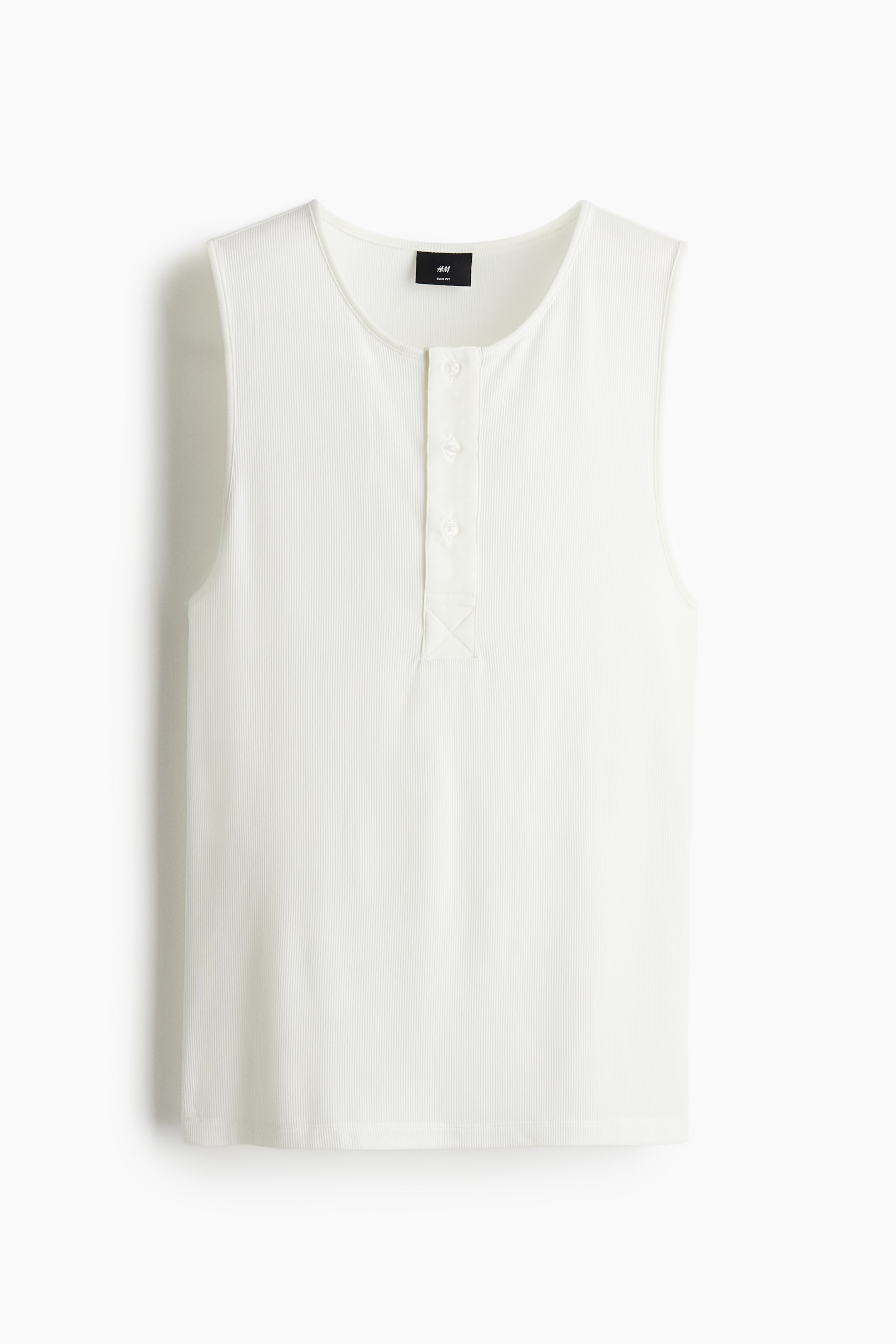 Débardeur en jersey côtelé d'épaisseur moyenne. Modèle avec encolure ronde et patte de boutonnage tissée en haut. Base droite. Coupe slim qui épouse la silhouette et met le corps en valeur.