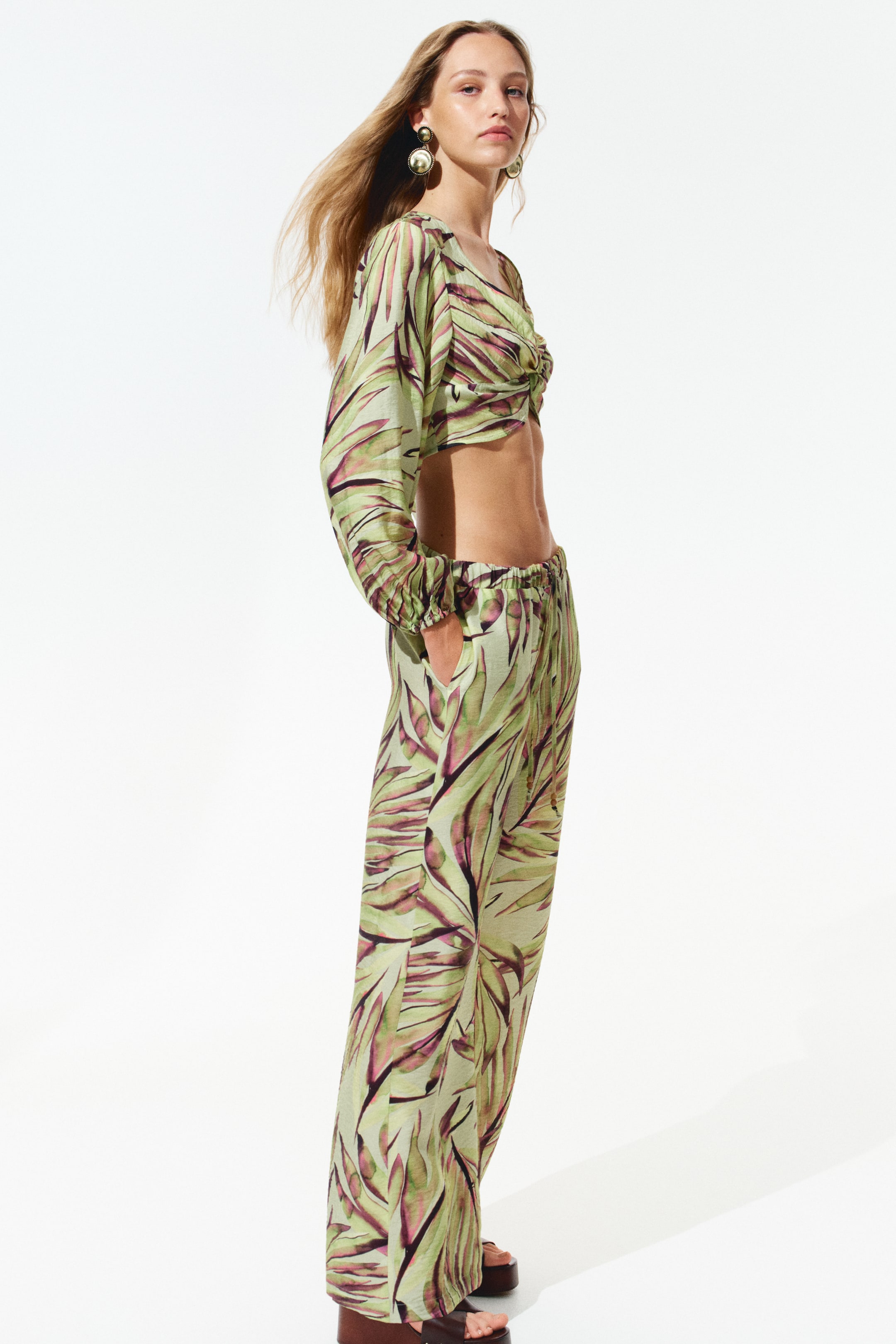 Pantalon en matière tissée. Modèle avec élastique habillé et cordon de serrage aux extrémités décorées d'une perle fantaisie à la taille. Poches latérales discrètes et jambes larges.