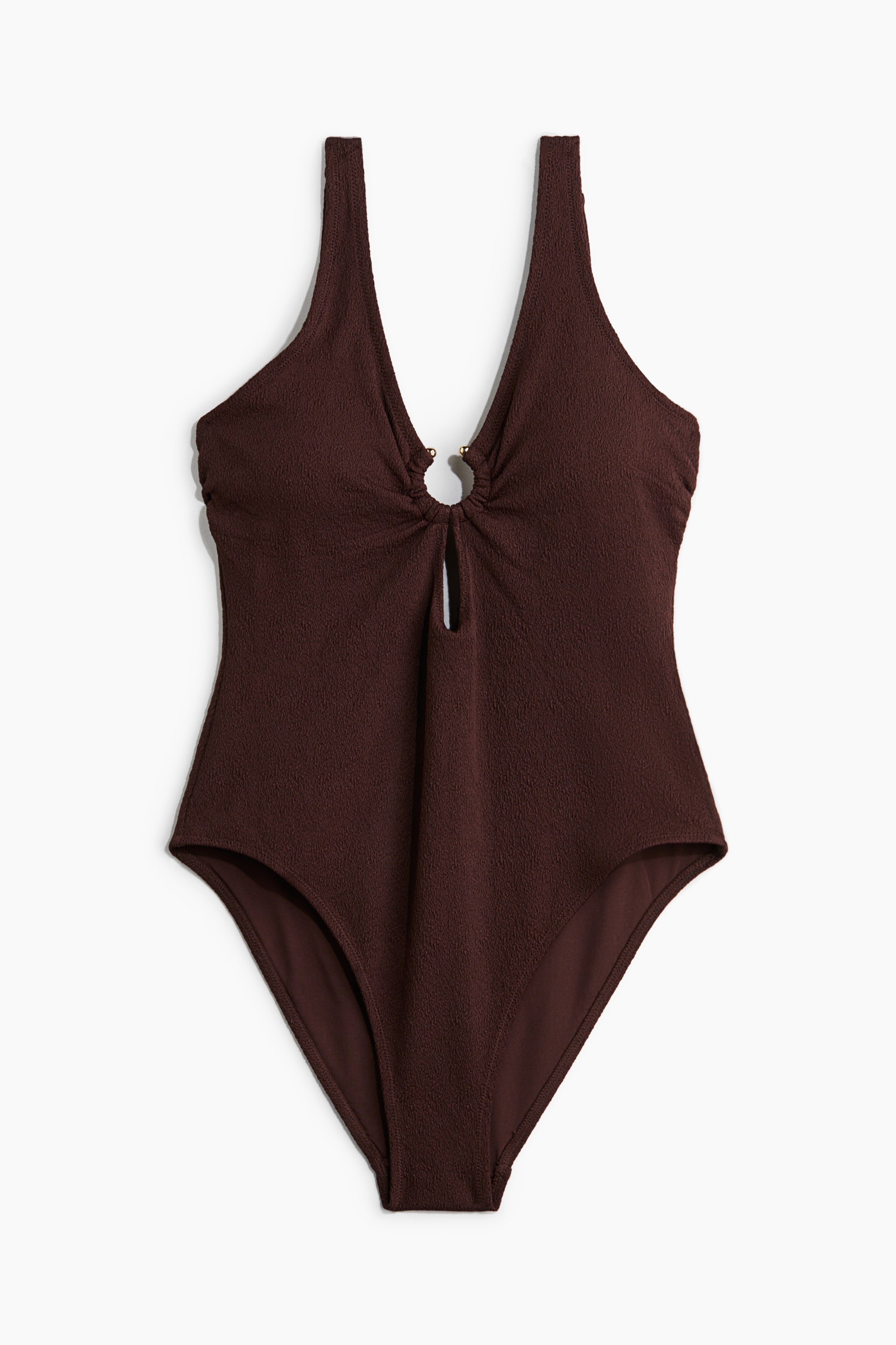 Maillot de bain à encolure en V avec anneau en métal habillé au centre de la poitrine. Modèle avec bonnets paddés qui galbent la poitrine et offrent un bon maintien. Bretelles larges et ouverture à la taille. Jambes échancrées et dos moyennement couvrant. Entièrement doublé.