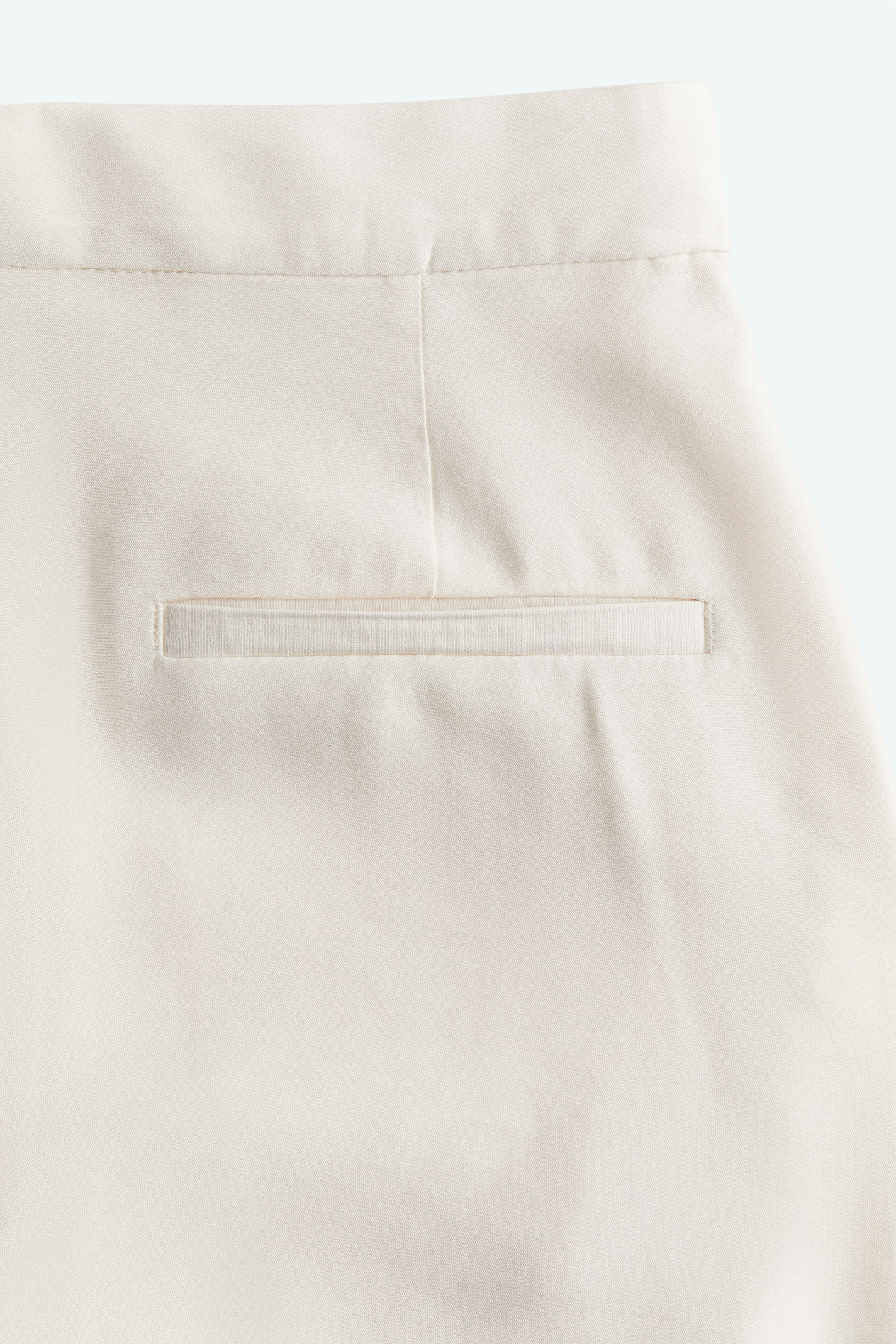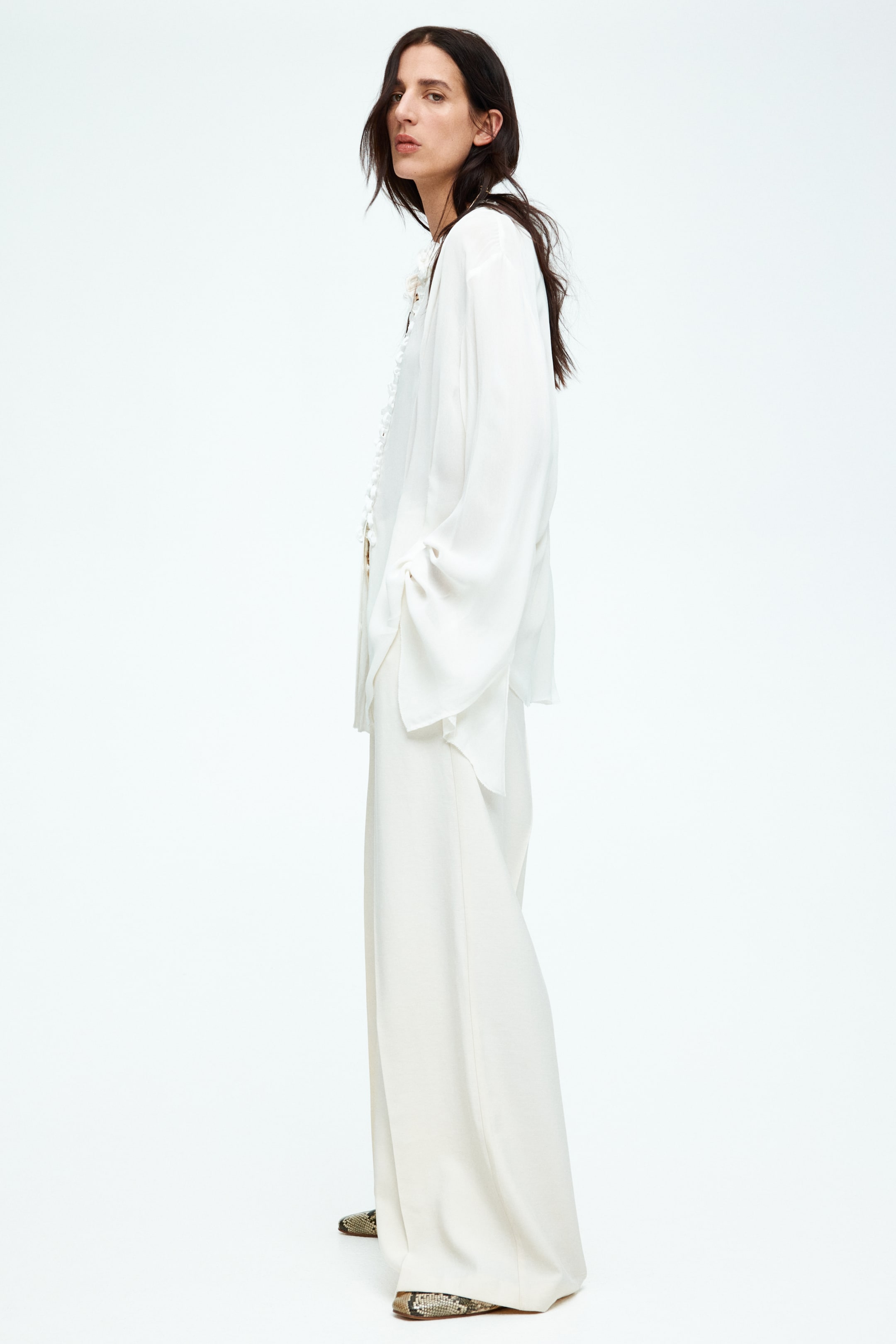 Pantalon en tissu de viscose mélangée. Modèle taille haute avec braguette zippée surmontée d'un bouton et d'une fermeture par agrafe et barrette dissimulés. Poches italiennes et fausses poches raglan dans le dos. Jambes larges avec plis marqués devant et dans le dos.