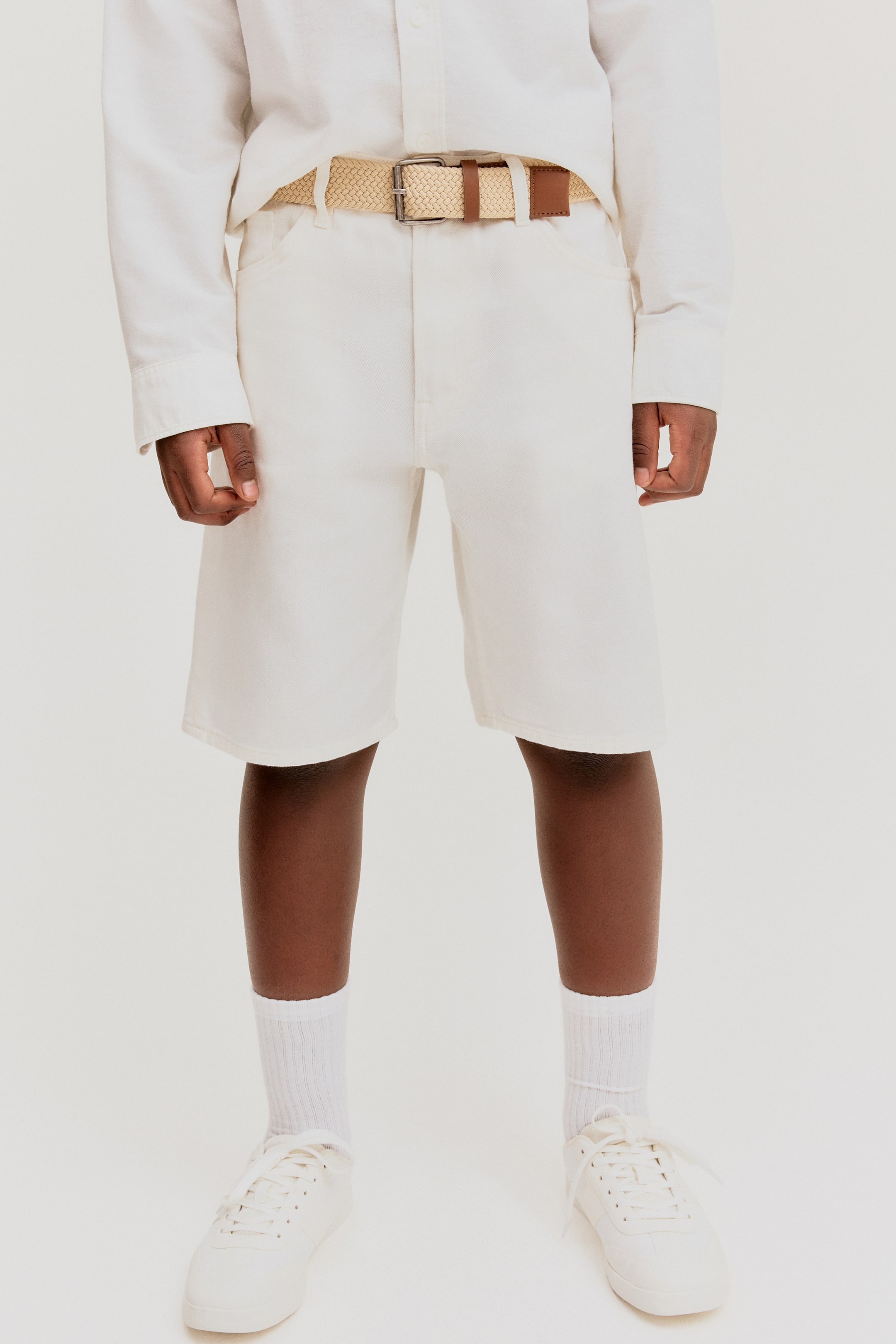 Short 5 poches en denim souple. Coupe flottante au niveau des hanches et des cuisses. Modèle avec élastique réglable à la taille et braguette zippée surmontée d'un bouton.