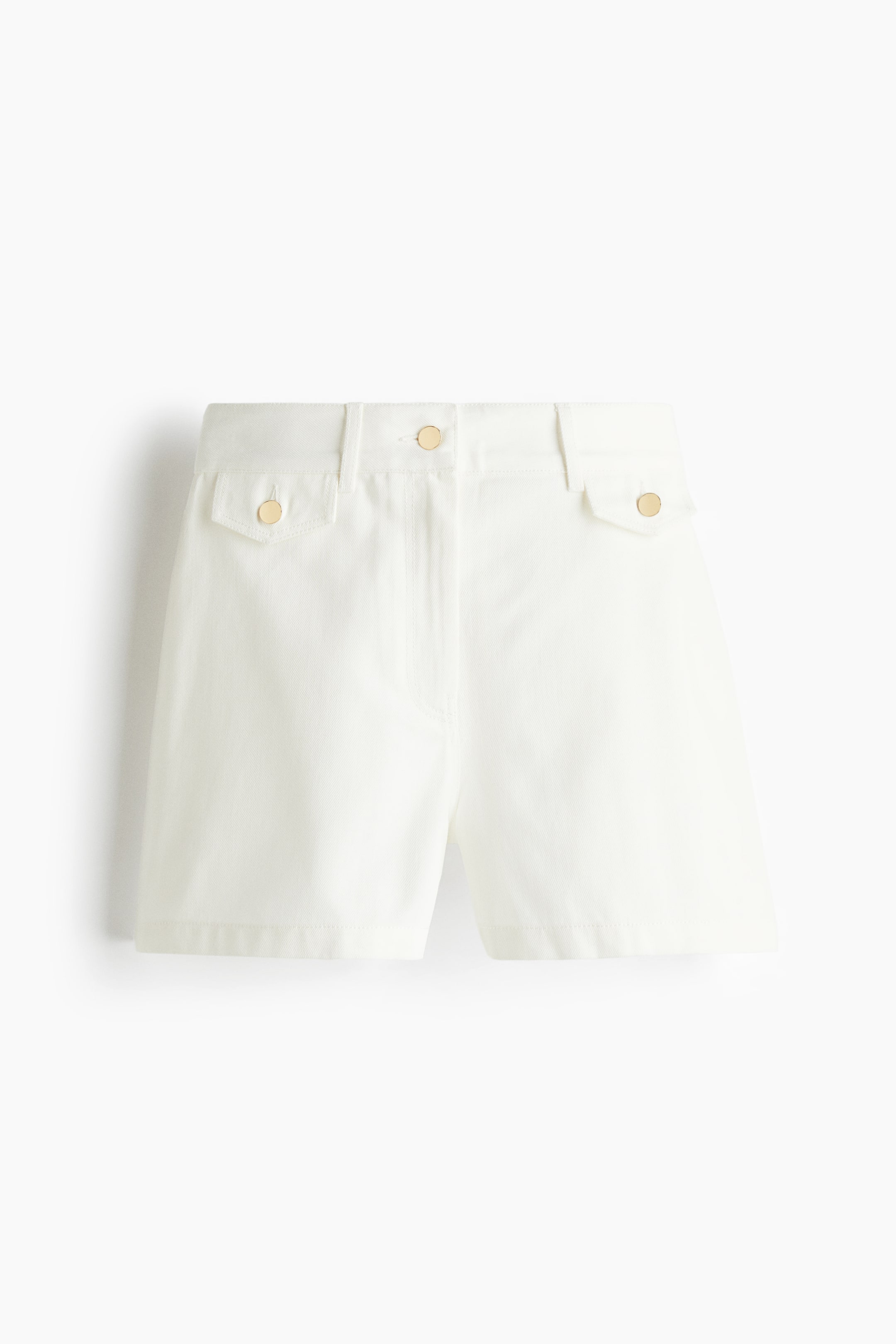 Short en coton tissé. Modèle taille haute avec braguette zippée surmontée d’un bouton. Rabats de poche décoratifs agrémentés d'un bouton devant et poches dans le dos.