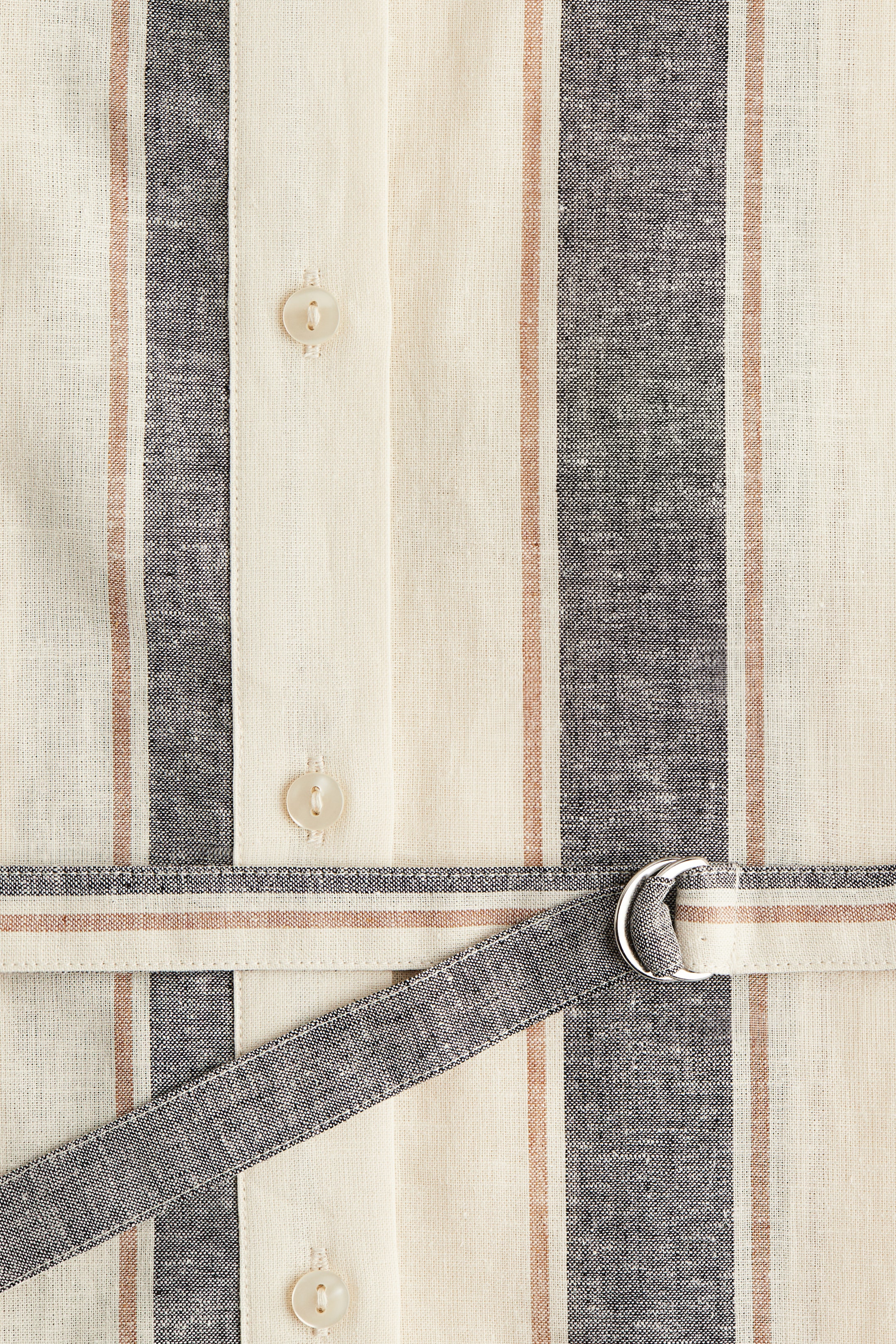 Robe de longueur genou en tissu aérien de lin et coton mélangés. Modèle avec col et boutonnage devant. Emmanchures descendues et manches longues terminées par fente et poignet fendu muni d'un bouton. Fine ceinture amovible munie d'anneaux D en métal. Base droite avec fentes latérales. Non doublée.