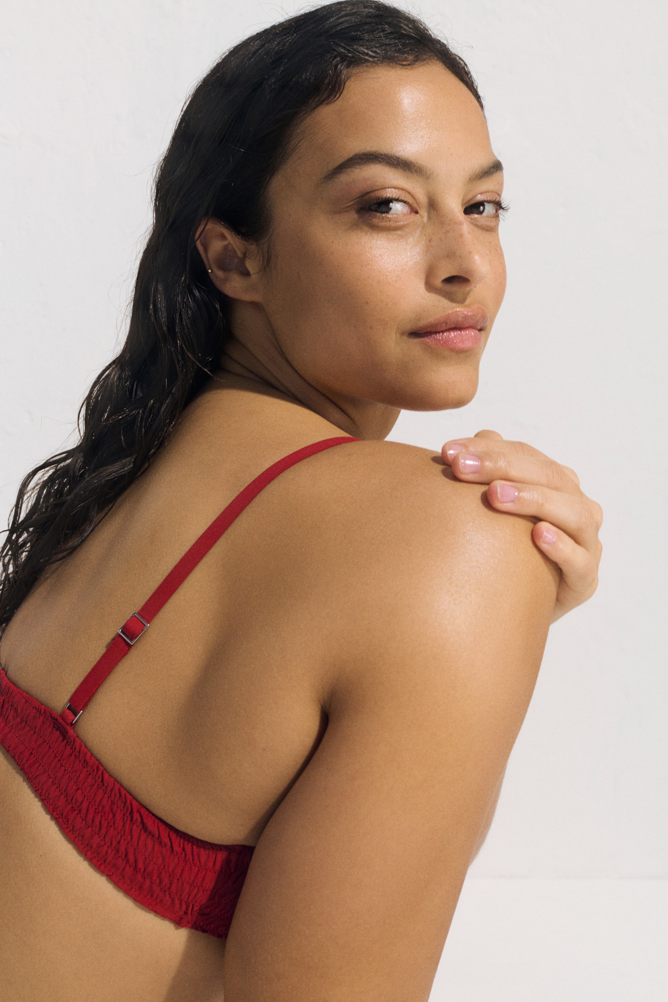 Haut de maillot smocké. Modèle sans armatures avec bonnets triangulaires qui donnent une forme naturelle à la poitrine et offrent un maintien léger. Bretelles réglables et fermeture par attache en métal dans le dos.