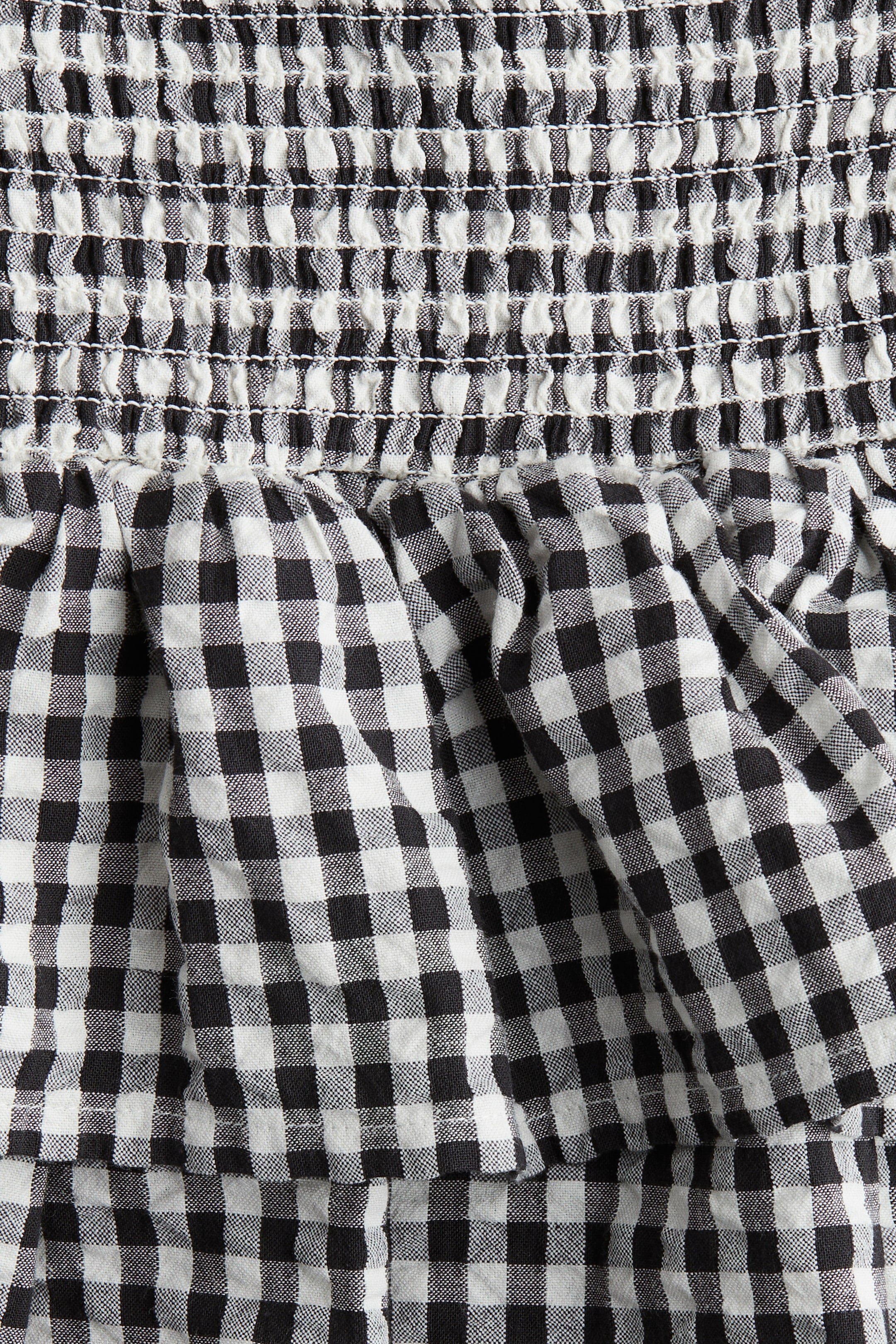 Jupe en tissu souple. Modèle avec large partie smockée à la taille et volants étagés à coutures froncées pour plus de volume.
