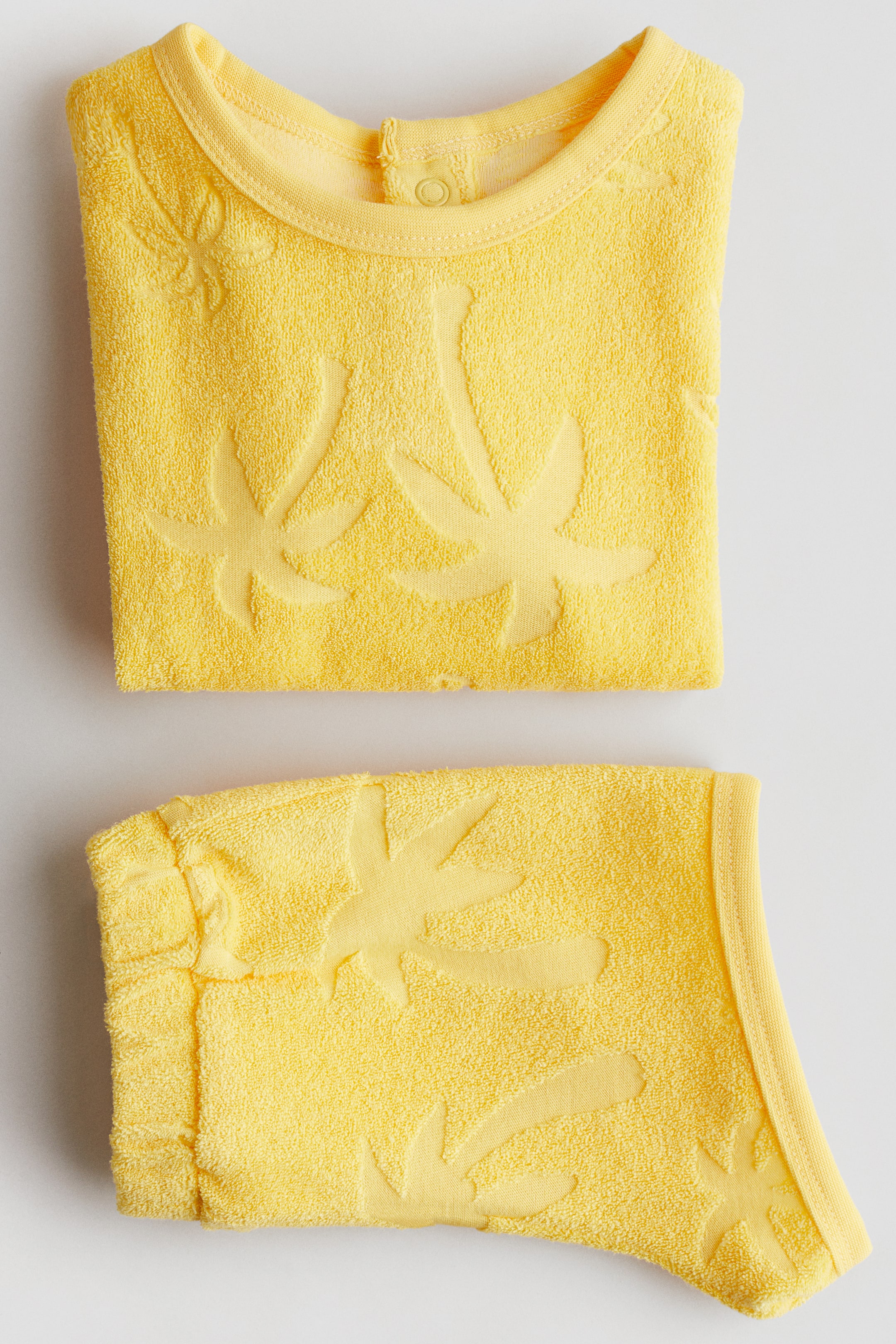 Ensemble en coton éponge doux à motif dévoré, composé d'un T-shirt et d'un short. T-shirt à encolure ronde avec emmanchures descendues et manches courtes terminées par biais. Ouverture munie de boutons-pression dissimulés dans le dos. Petites fentes latérales à la base. Short avec élastique réglable à la taille et biais en bas de jambe.