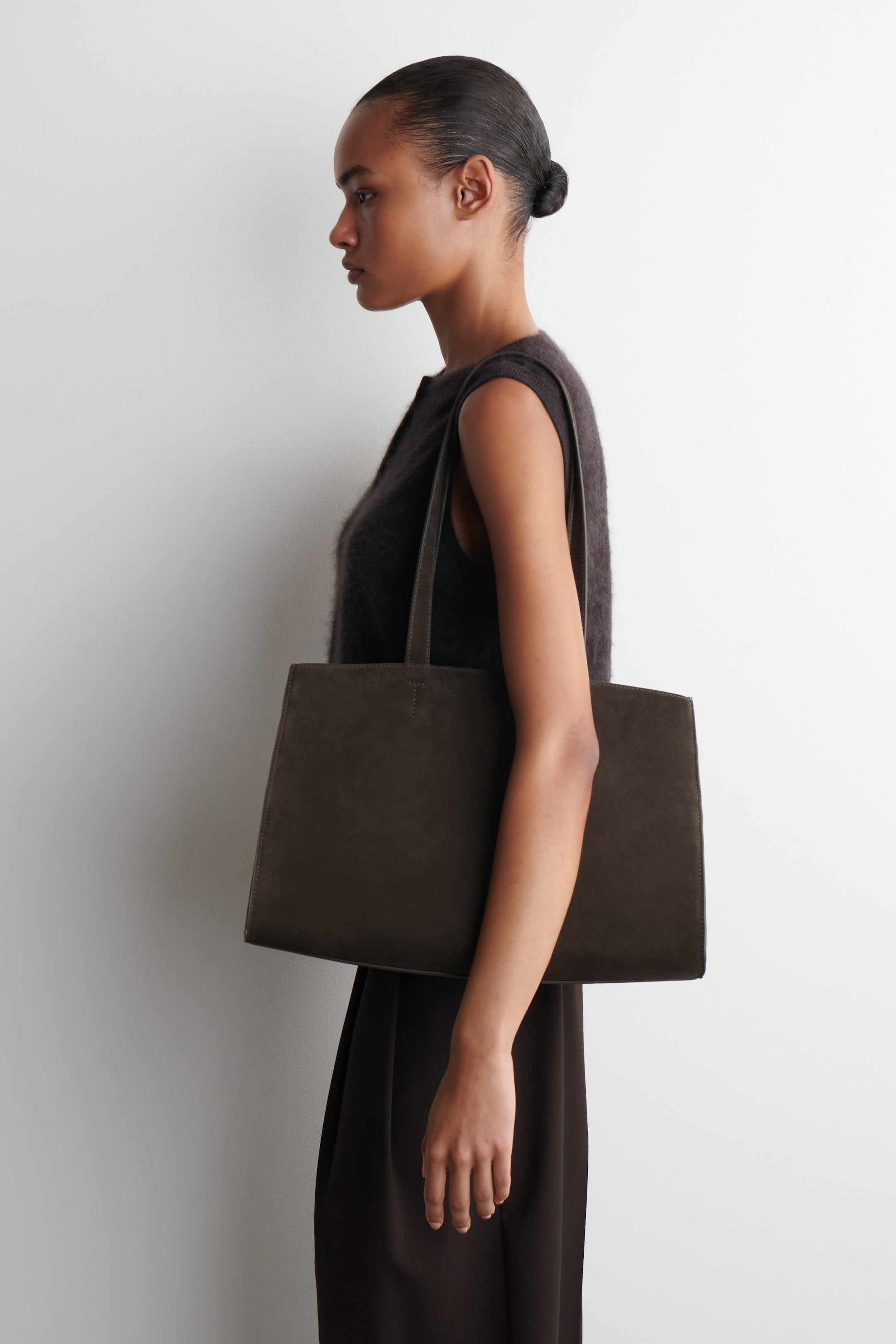 Cette saison, les créateurs d'accessoires COS revisitent l'esprit des années 90 avec une touche moderne. Confectionné en daim souple brossé, le sac cabas Gallery dessine une silhouette raffinée de style est-ouest avec des anses allongées et des poches intérieures pour vos essentiels. Ses côtés sont ornés de petits aimants qui permettent de le cintrer. Fermeture à clip COS soutient une fabrication plus consciencieuse en collaborant avec le Leather Working Group. Matière : 100 % Daim. Doublure : 100 % Coton recyclé. Excluant les finitions Hauteur : 27,5 cm, Largeur : 40,5 cm, Profondeur : 20 cm