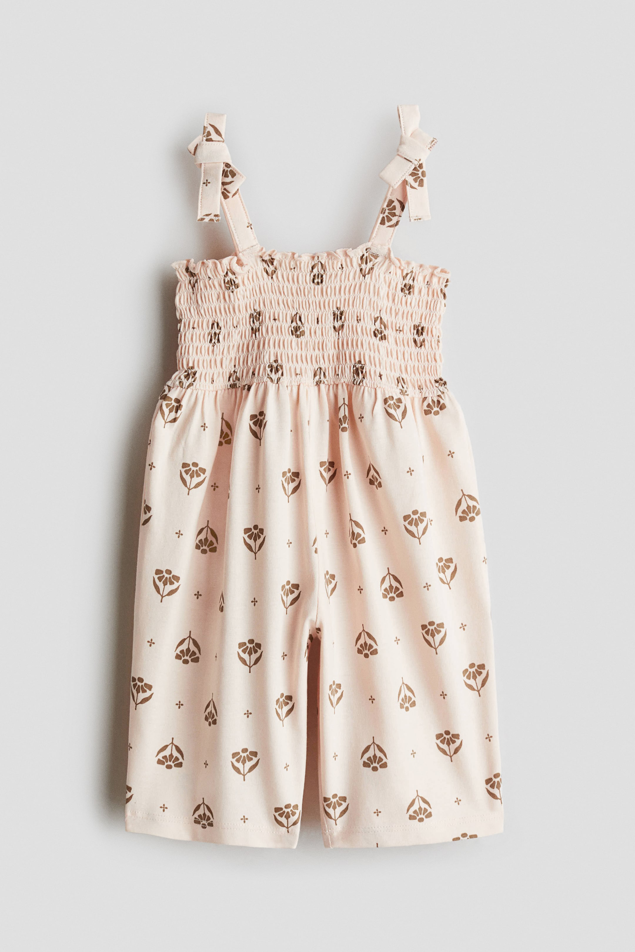 Combinaison imprimée en jersey de coton doux avec corsage smocké. Modèle à encolure carrée avec fines bretelles agrémentées d'un nœud cousu sur les épaules. Fronces à la taille et jambes larges, de longueur cheville.