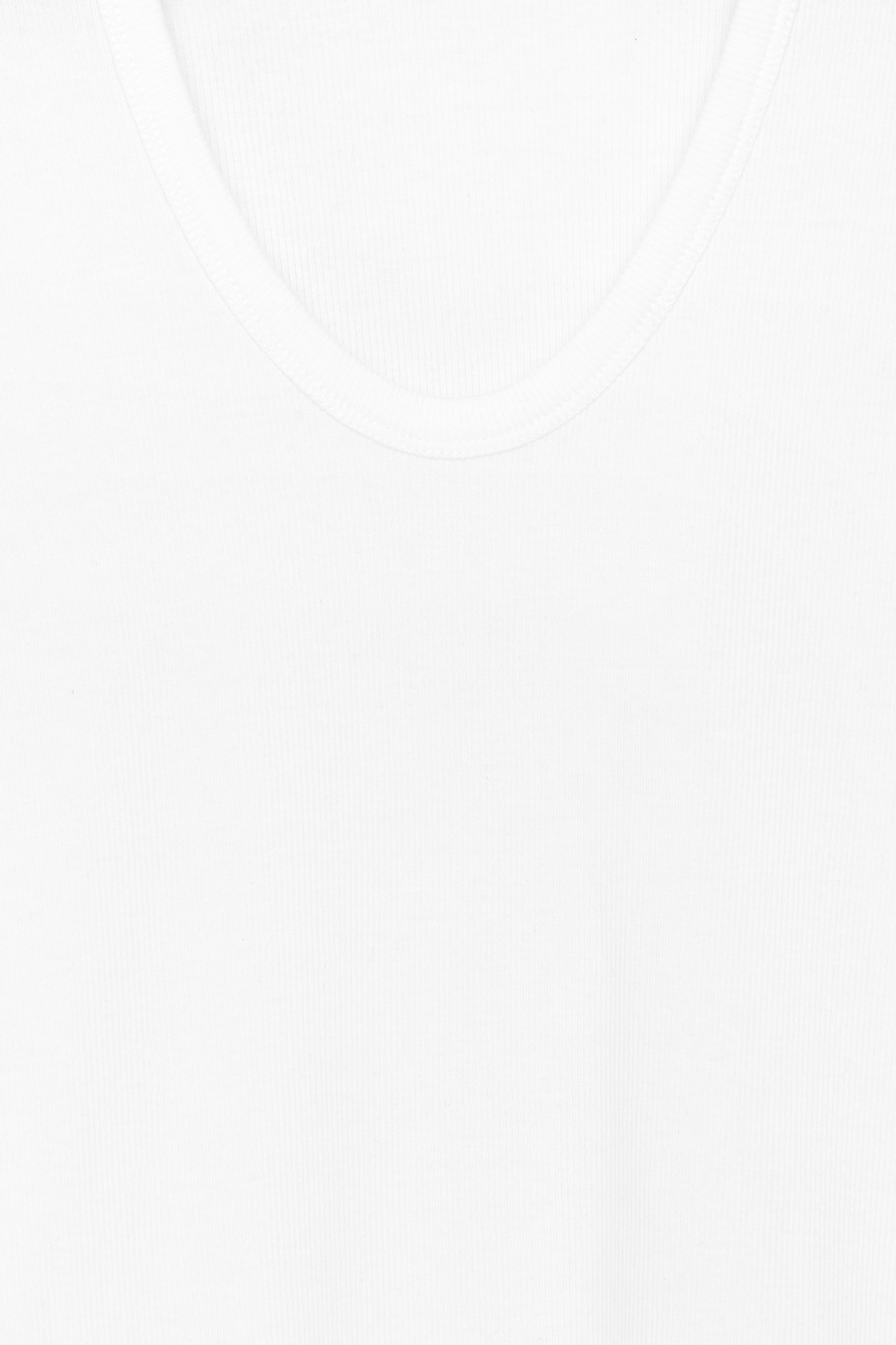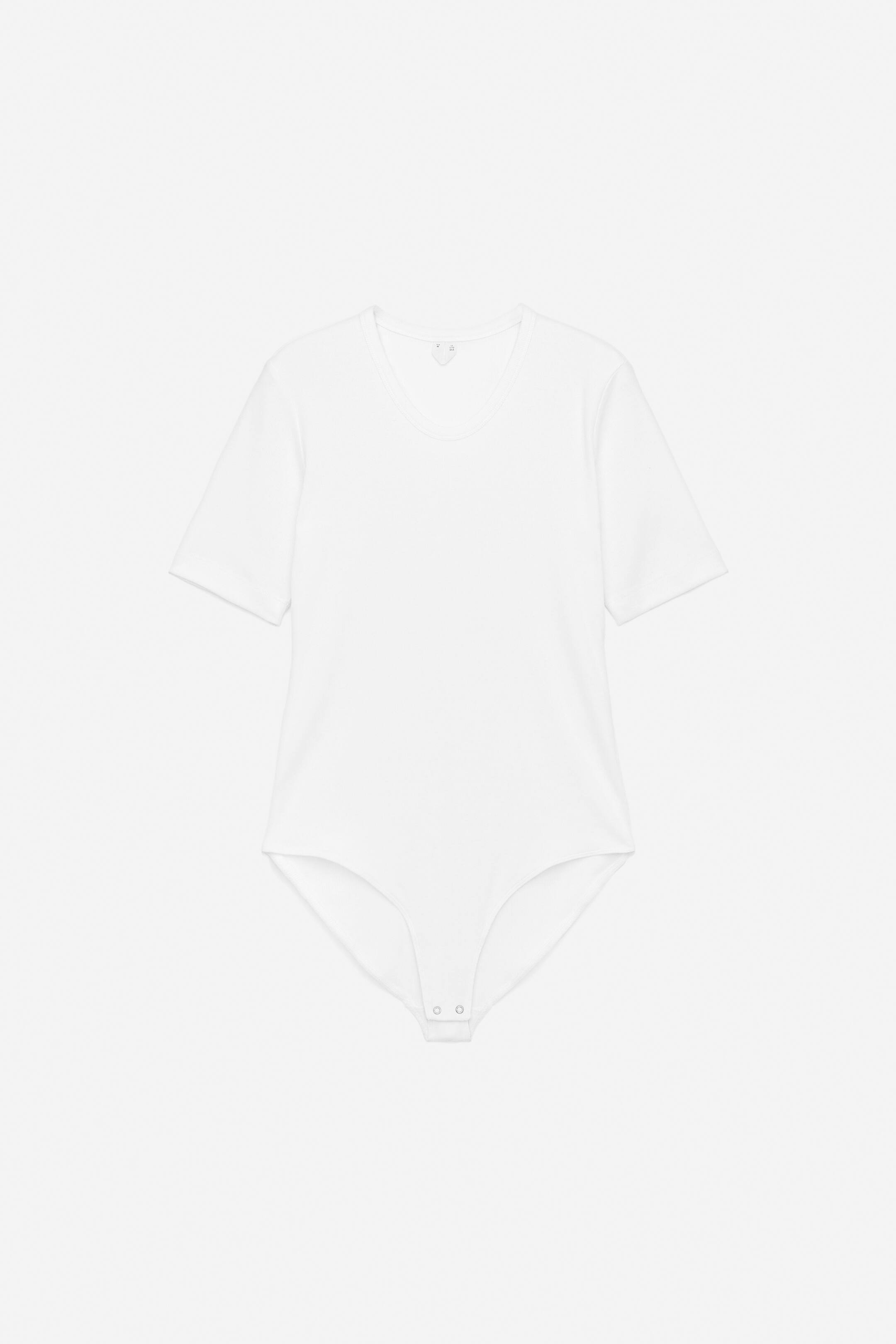 Body près du corps en jersey côtelé. Modèle à manches courtes avec des bords repliés et une encolure en U.