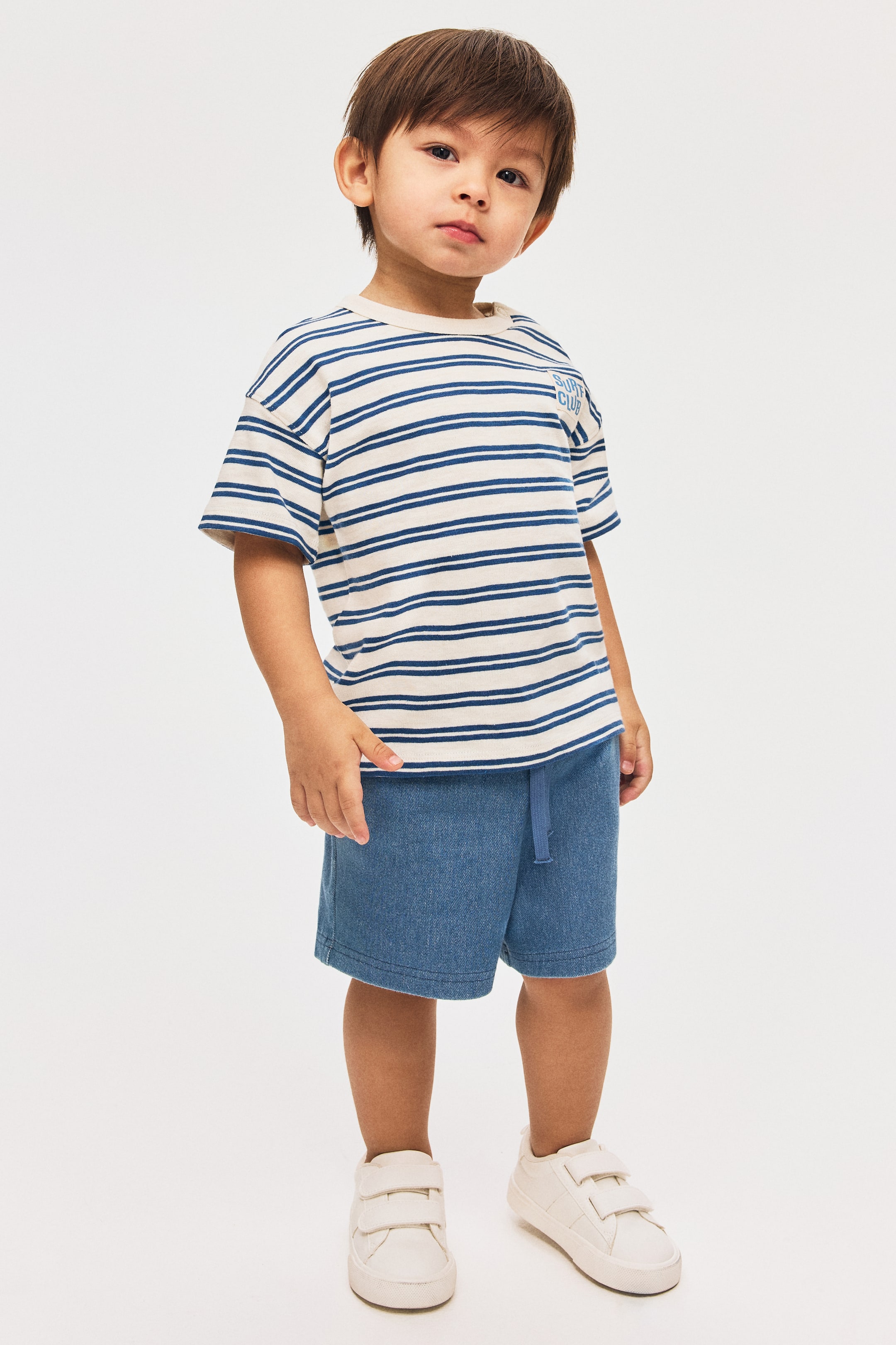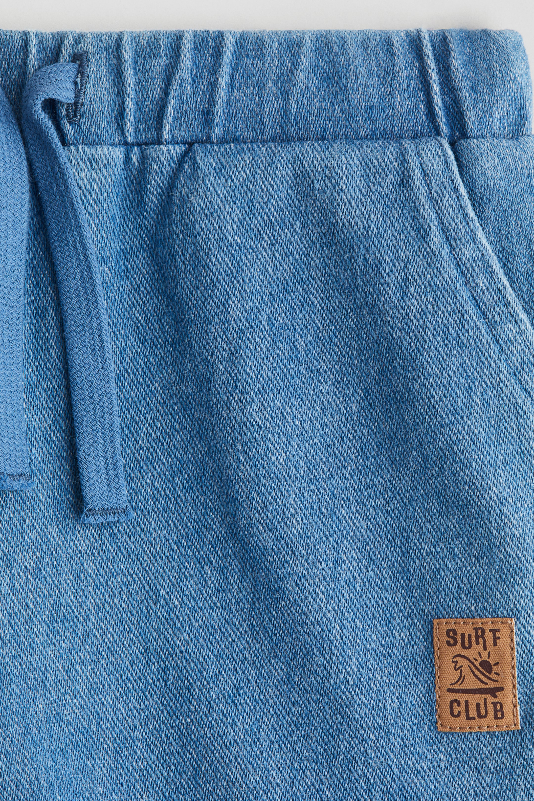 Short en jersey souple à l'aspect denim. Modèle avec élastique et cordon de serrage à la taille. Poches obliques devant.