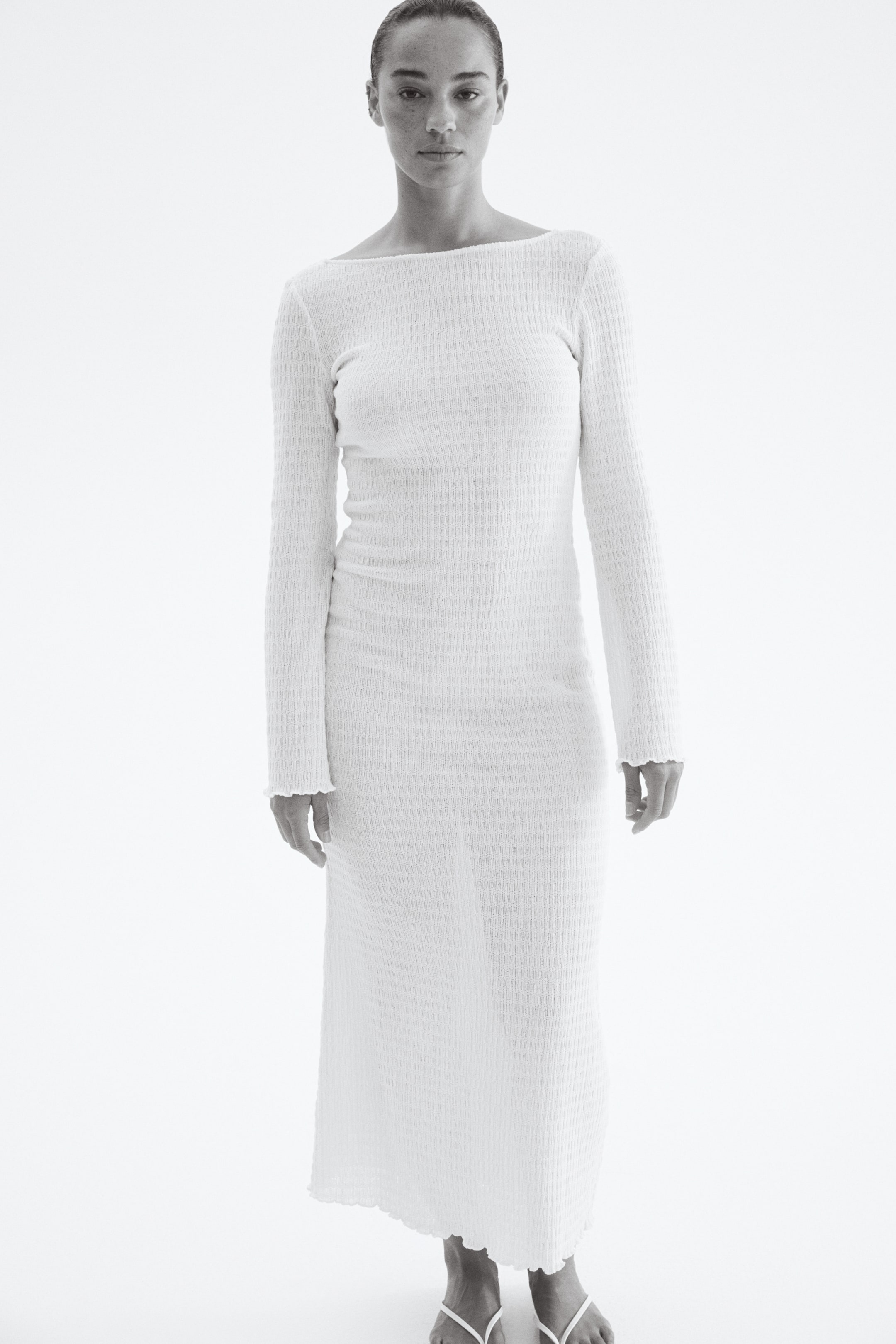 Robe longue en jersey texturé. Modèle avec encolure bateau, manches longues et décolleté arrondi plongeant dans le dos. Bord surjeté aux poignets et à la base.
