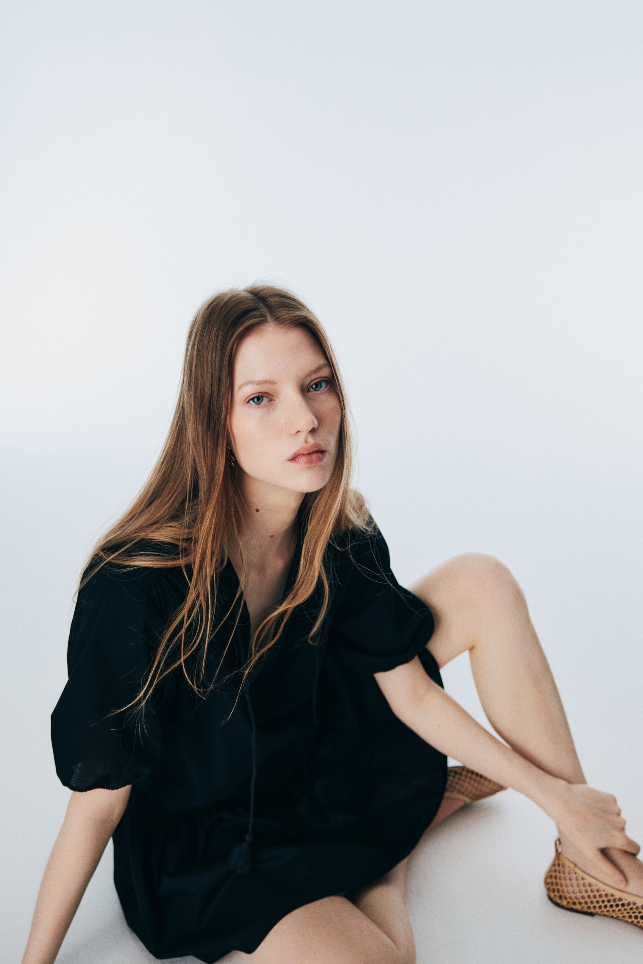 Robe courte en tissu souple de coton mélangé. Coupe flottante avec encolure ronde et ouverture en V plongeante agrémentée de petits liens à nouer devant. Coutures d'épaule légèrement décalées vers l'avant, soulignées de fronces devant, et manches bouffantes mi-longues terminées par élastique. Empiècement dans le dos. Couture froncée sur les hanches et base évasée.