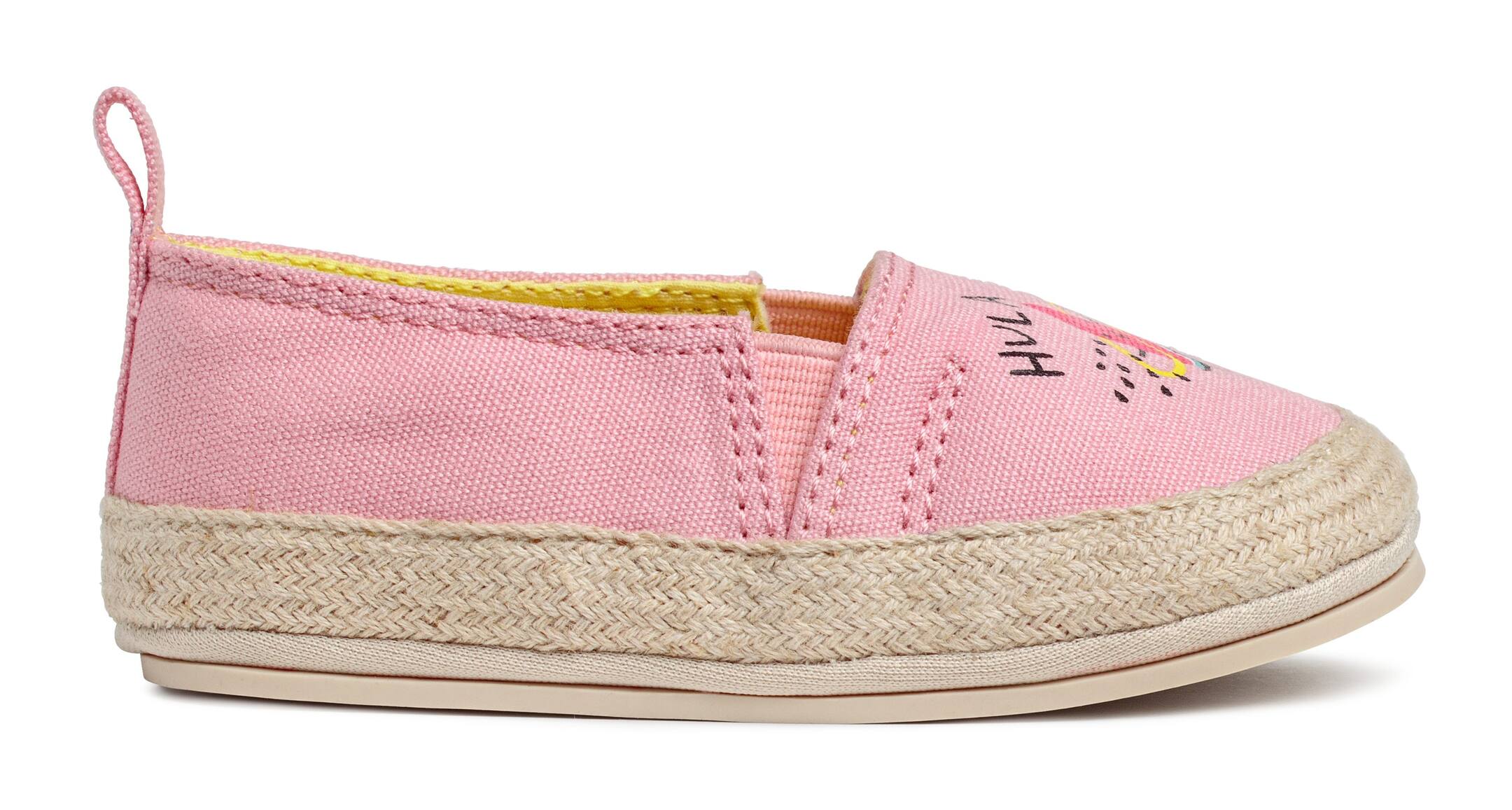 Espadrilles avec bande de juté tressée autour de la semelle. Doublure et semelle en twill de coton. Semelle de marche en caoutchouc.