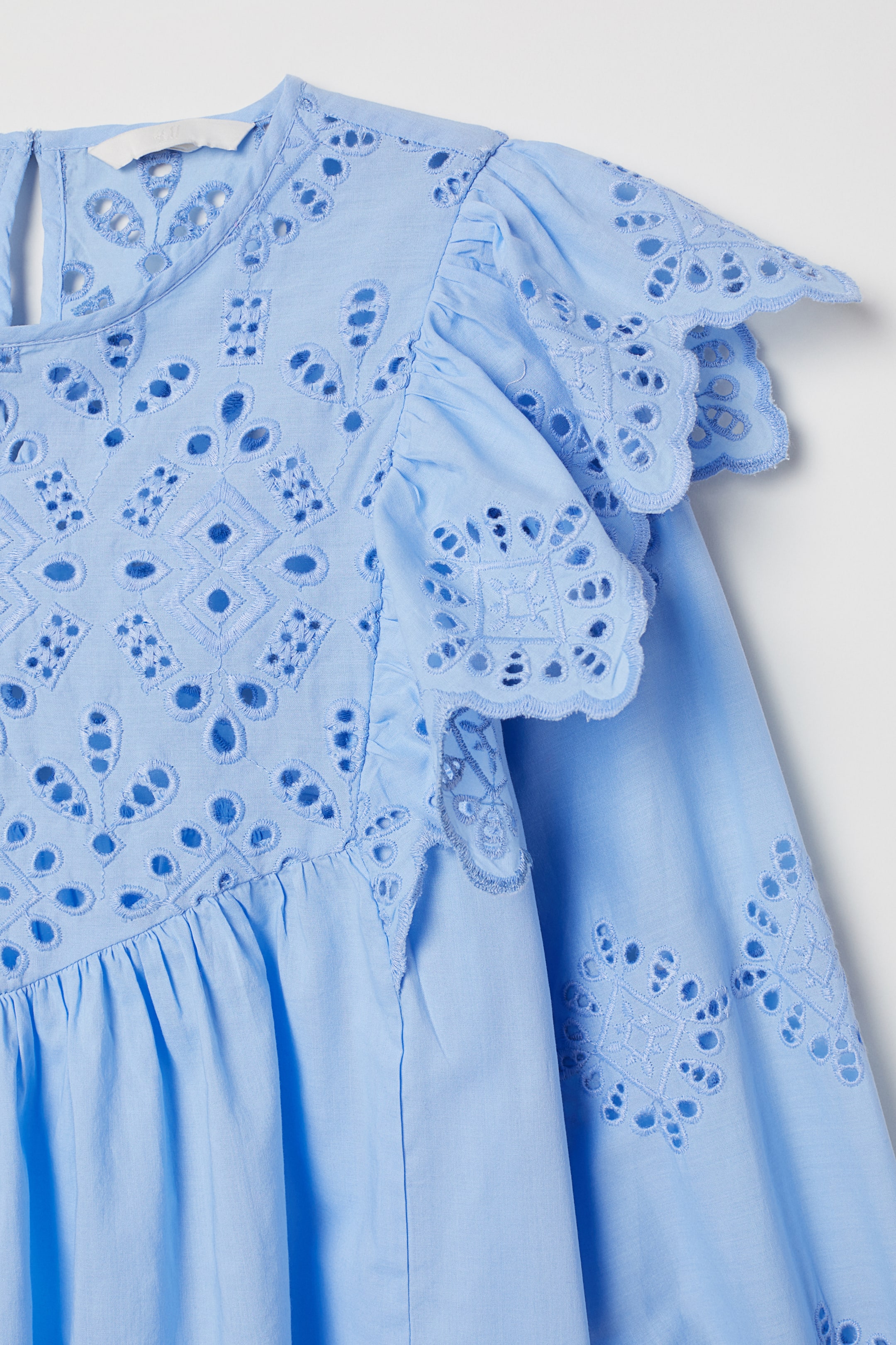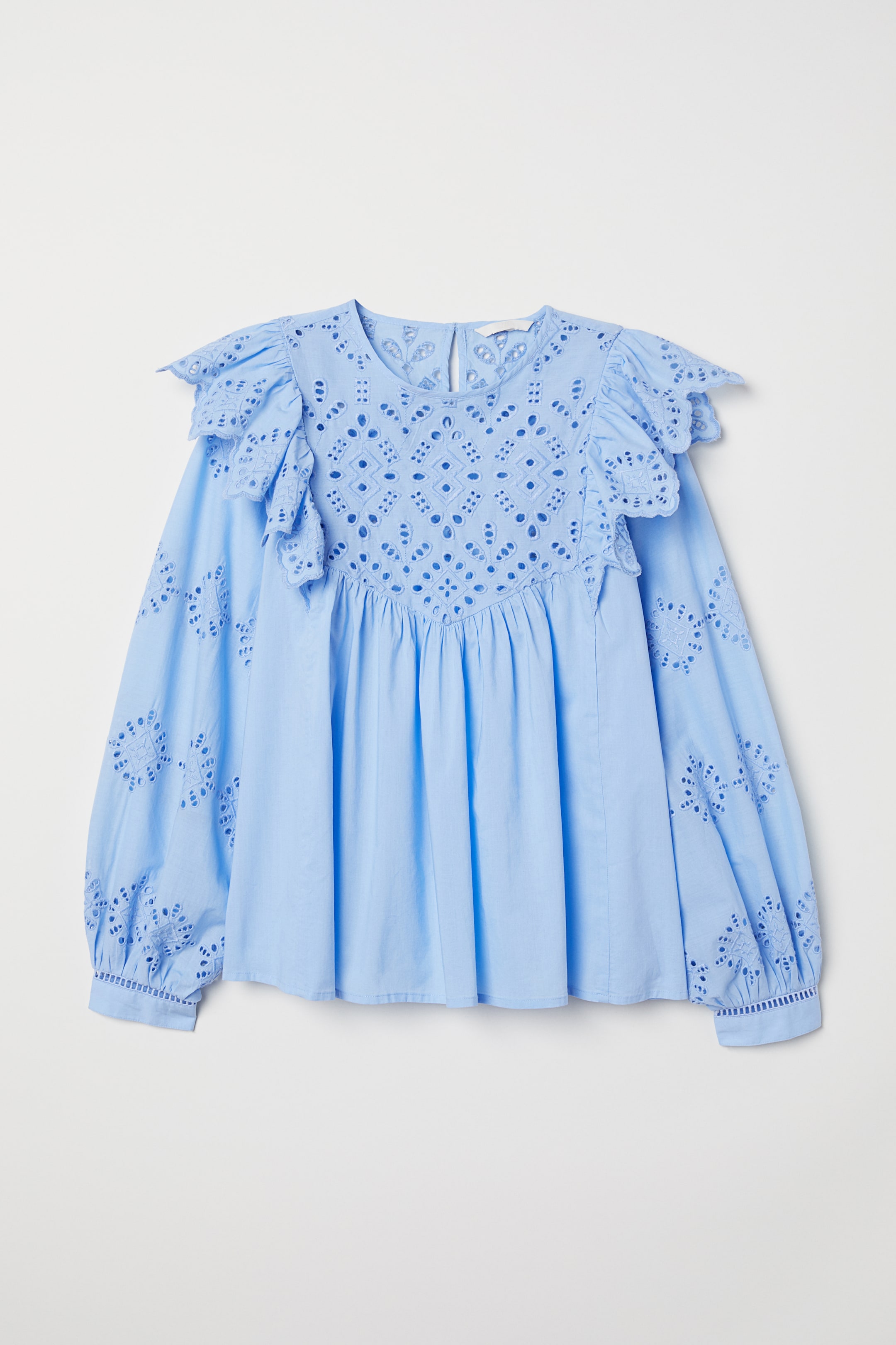 Blouse tissée avec broderie anglaise. Modèle avec empiècement d’épaules volanté et larges manches longues terminées par petit poignet boutonné. Ouverture dans le dos surmontée d’un bouton sur la nuque.