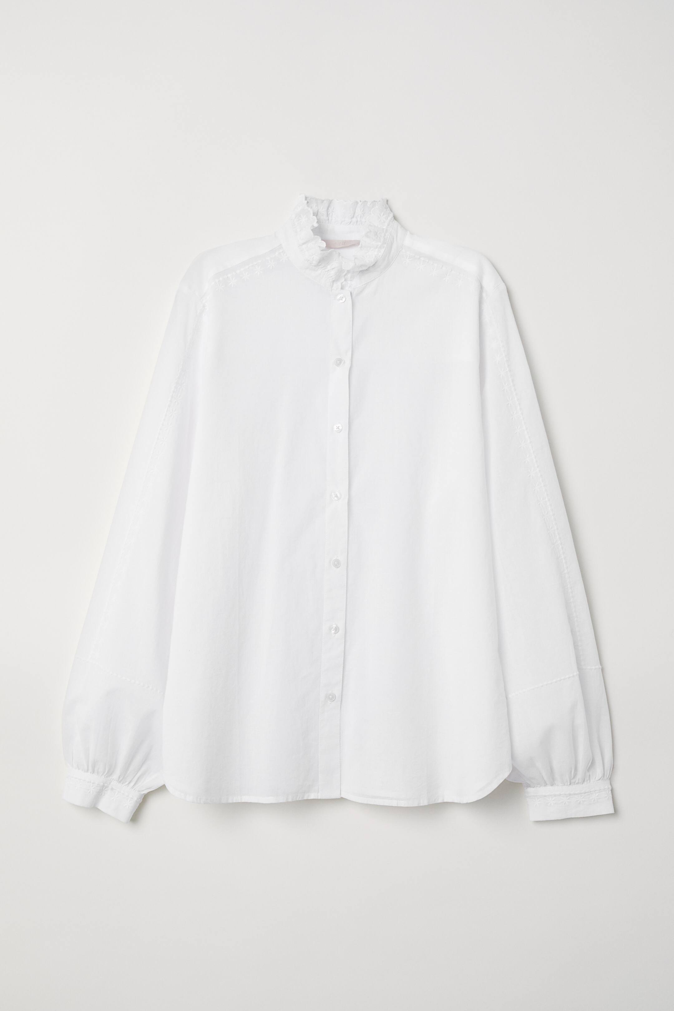 Blouse en tissu de coton aérien avec broderies. Modèle avec petit col volanté et boutonnage devant. Emmanchure légèrement descendue et longues manches plutôt amples, terminées par mince poignet boutonné.