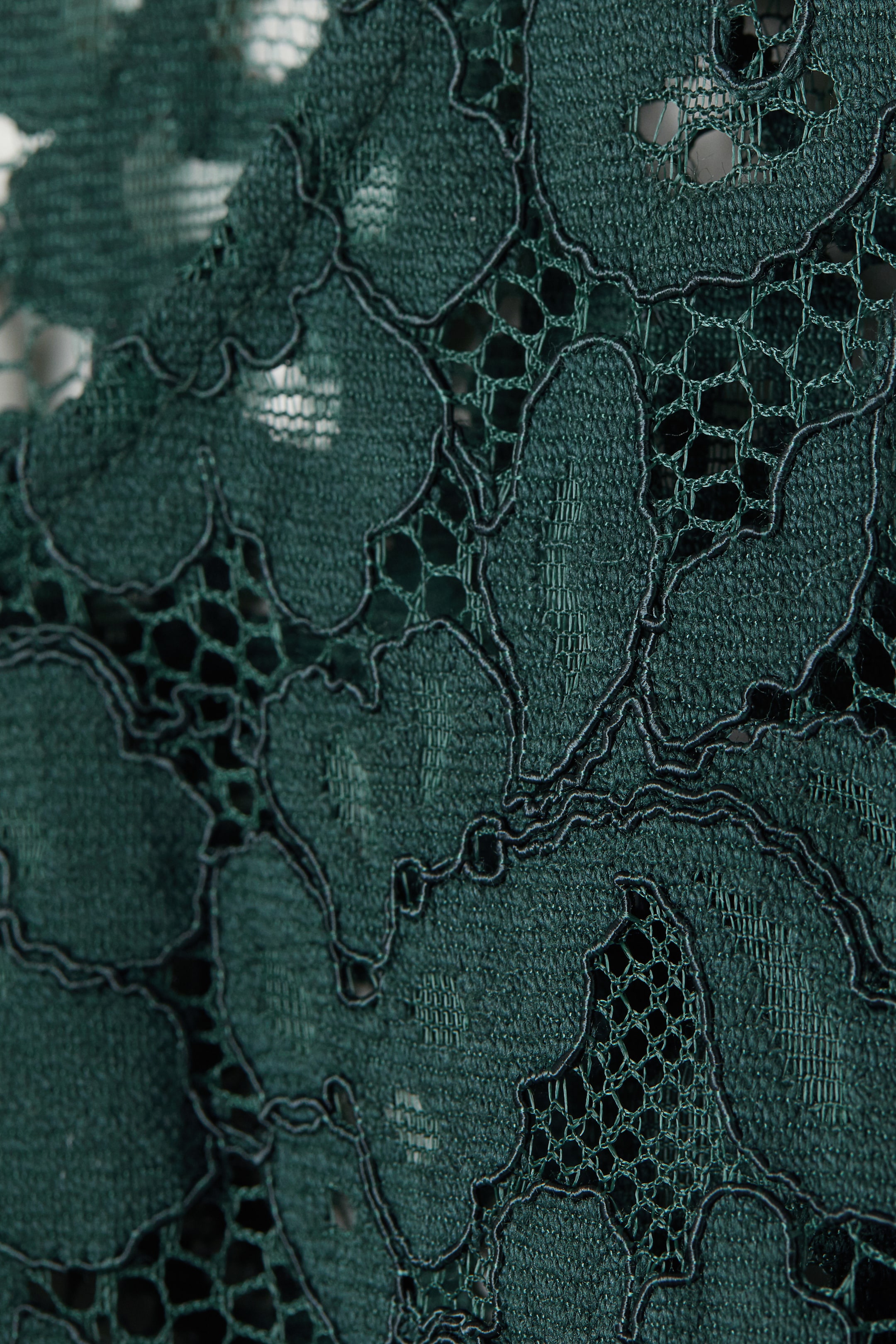 Robe courte en dentelle ajourée. Coupe droite avec encolure ronde, épaules matelassées et manches longues. Fermeture à glissière dissimulée dans le dos. Partiellement doublée.