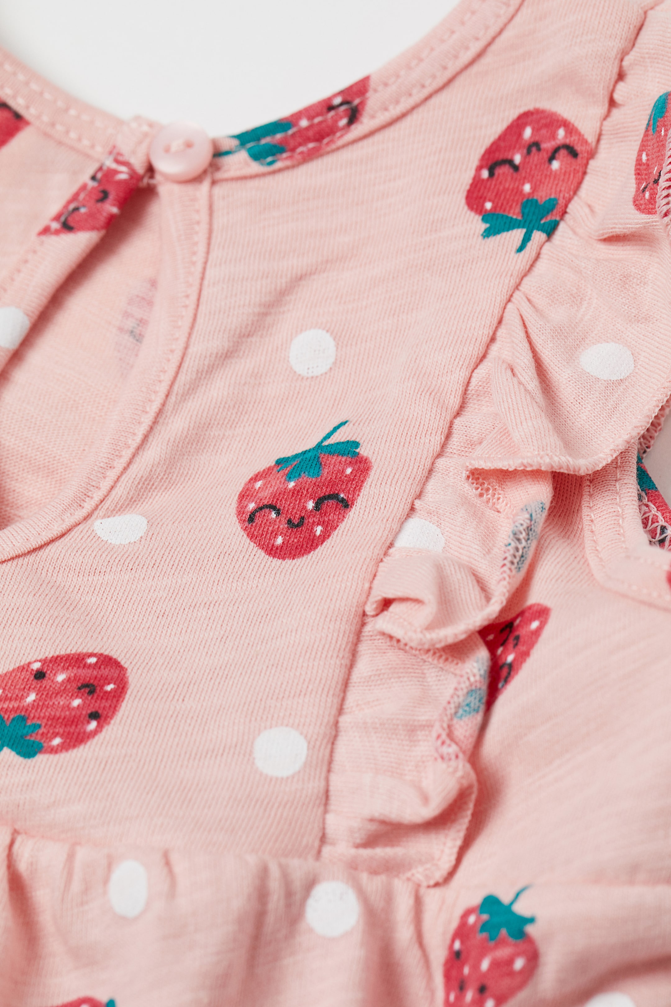 Robe sans manches en jersey de coton flammé. Modèle avec volants en haut et petite ouverture dans le dos surmontée d’un bouton sur la nuque. Découpe avec jupe évasée.