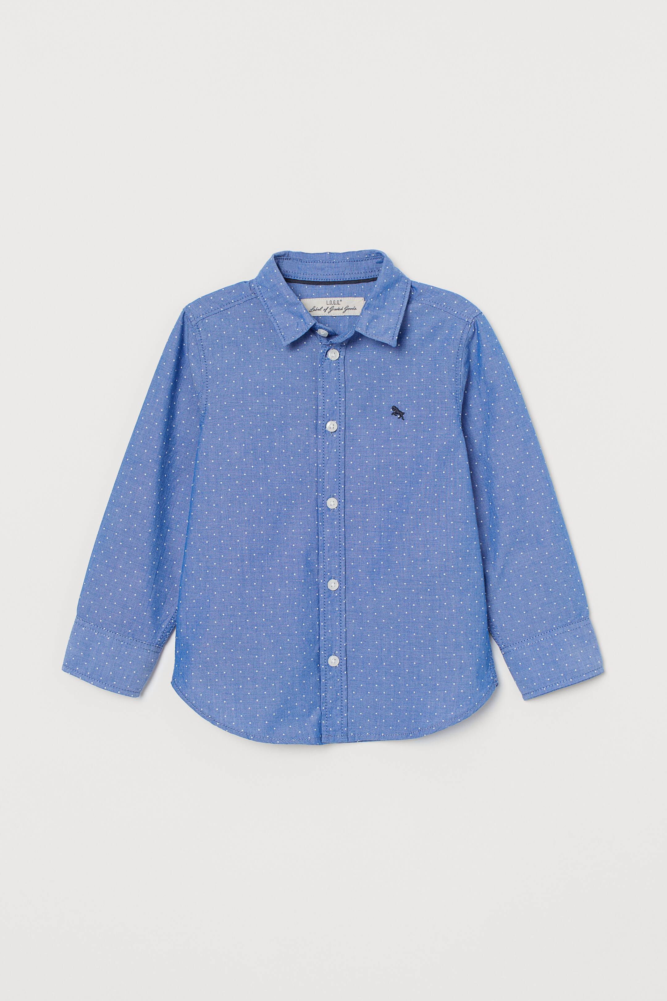 Chemise en coton tissé. Modèle avec col et boutonnage devant. Manches longues terminées par poignet boutonné. Doublure contrastante à l’intérieur du col et des poignets. Base arrondie.