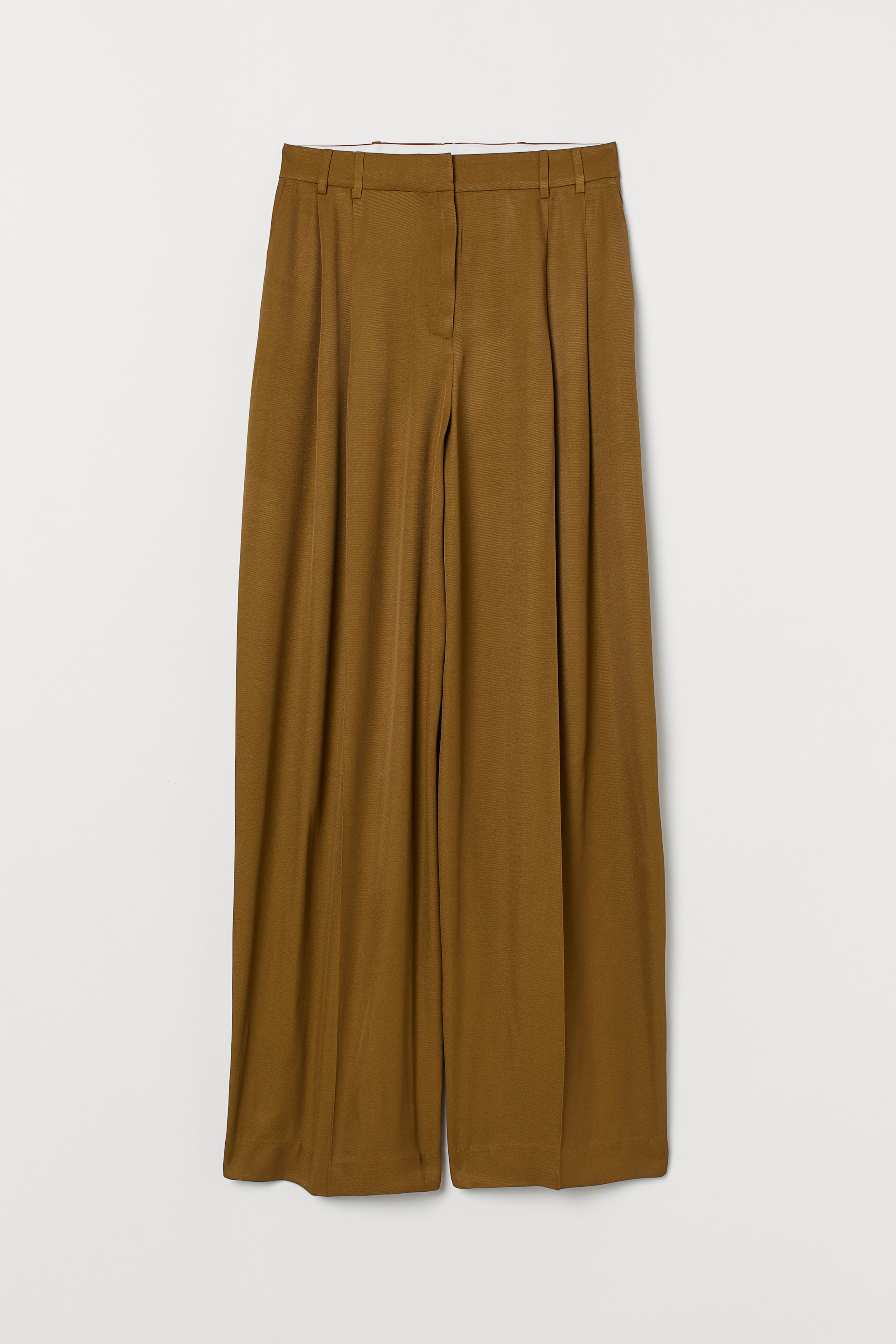 Pantalon tissé. Taille haute avec plis couchés devant. Braguette zippée surmontée d’agrafes. Poches latérales et fausses poches passepoilées dans le dos. Jambes droites et larges.