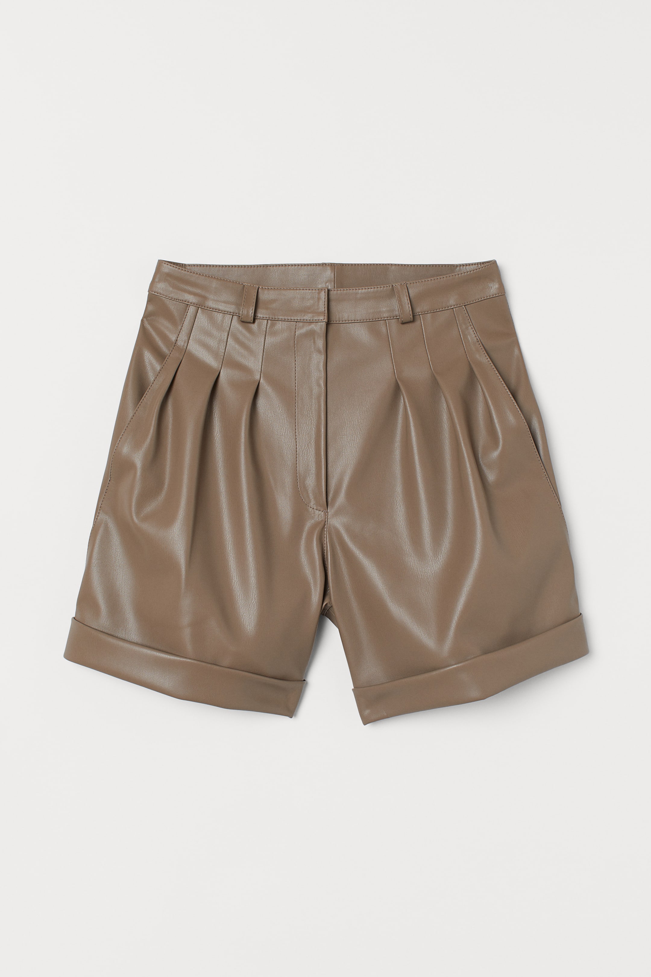 Short en imitation cuir. Modèle taille haute avec braguette zippée surmontée d’une agrafe dissimulée. Plis couchés en haut, poches latérales et poches passepoilées décoratives dans le dos. Revers cousu en bas de jambe.